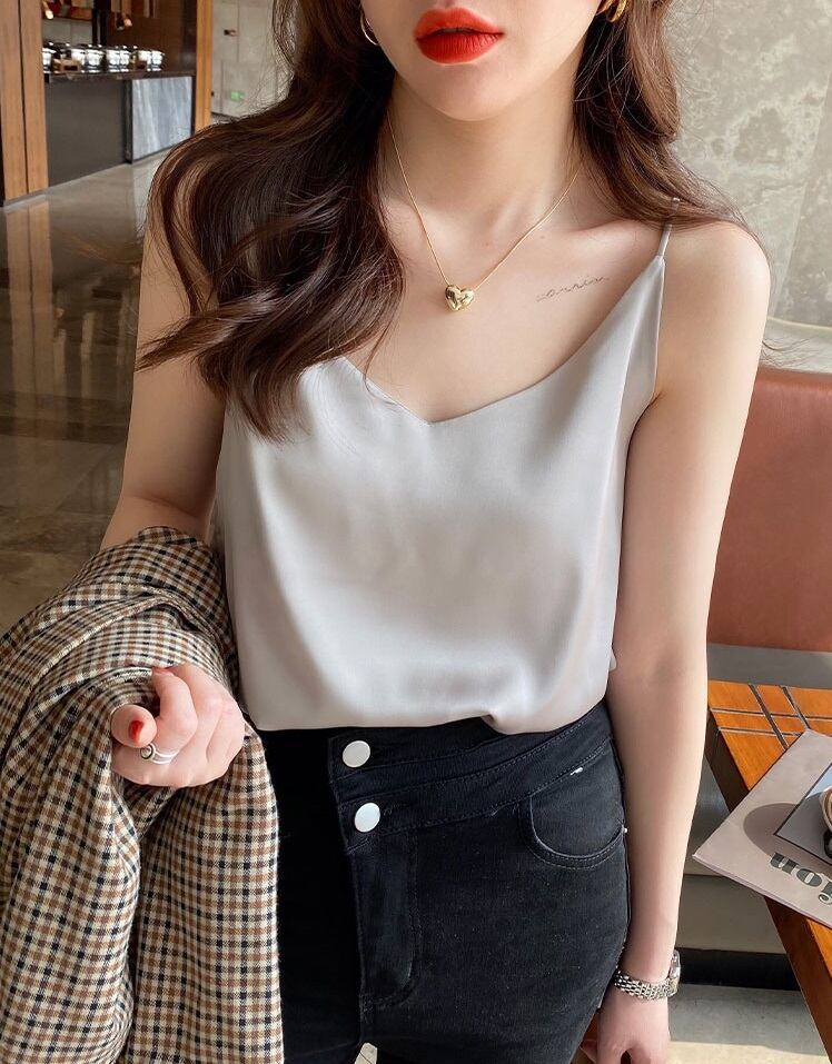 このサテン調Vネックキャミソールがあなたのおしゃれな日々をさらに輝かせますように。ぜひ、お手元にお迎えください。