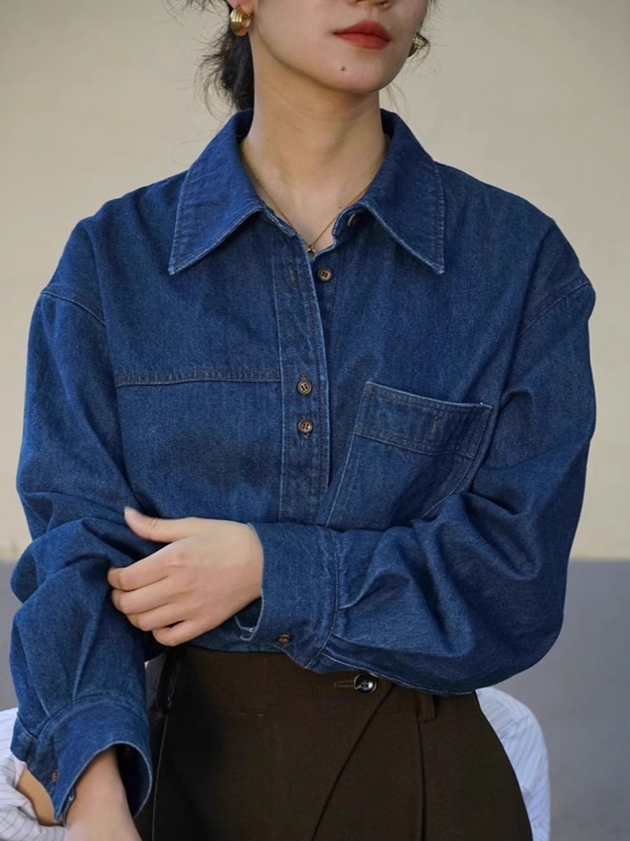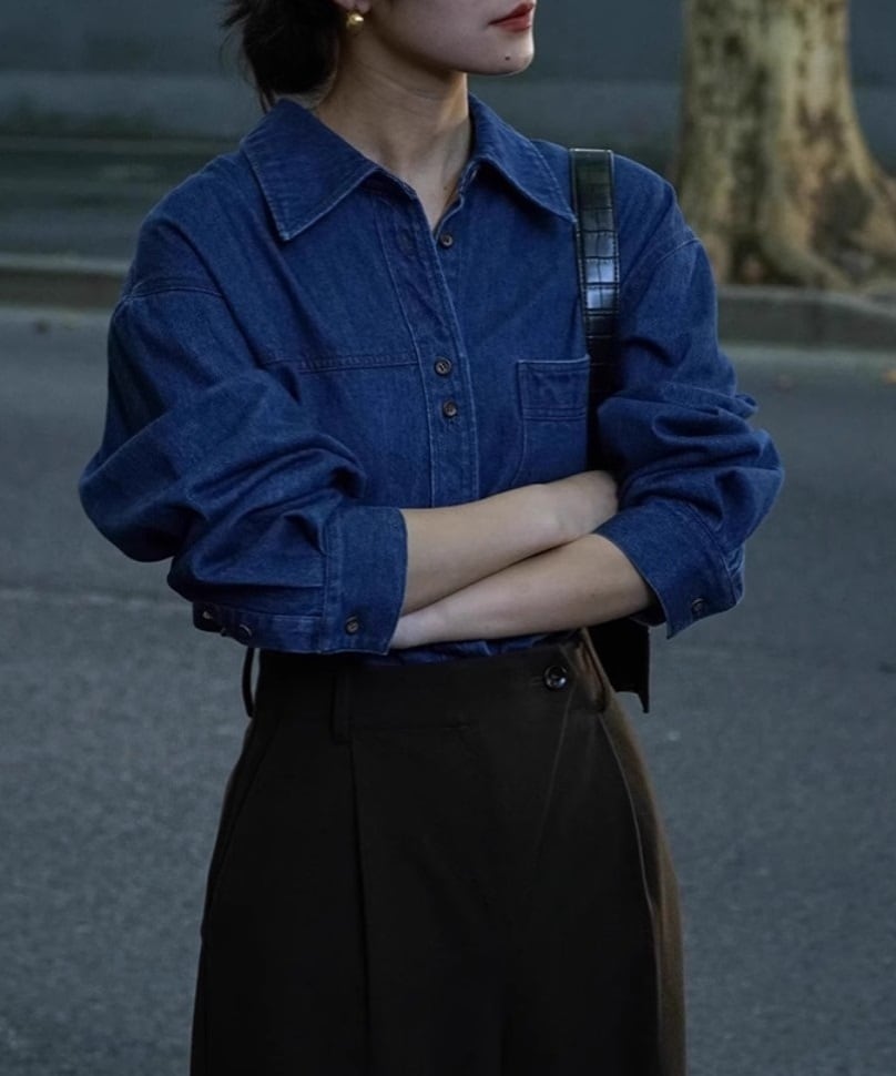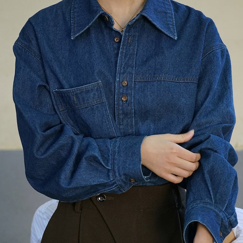こなれ感たっぷりの長袖デニムシャツが新登場!シンプルながらも個性的なボタンやポロカラーがおしゃれなアクセント。ヴィンテージ風のデザインがカジュアルスタイルにぴったりフィットします。2タイプの生地の厚さが選べ、軽めの厚さで春先から冬まで長く着用でき、重ね着のベースにも最適です。キュートなデニムシャツで、マニッシュから大人可愛いスタイルまで幅広くコーディネート可能。シンプルでありながら個性的な着こなしを楽しみたい方におすすめの一枚です。