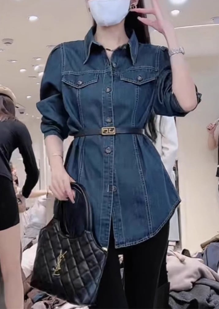 ベルト付き デニムシャツ レディース トップス シャツ 羽織 丈長 長袖 襟付き 角襟 ポロカラー Aライン ベルト ウエストマーク ポケット ハイウエスト 前開き ボタン デニム ブルーデニム かわいい 大人可愛い シンプル カジュアル 上品 おしゃれ こなれ感 ルーズ 無地 春 秋 冬 ママ 通勤 学生 学校 通学 デート お出かけ 旅行 公園 女子会 休日 ショッピング カフェ 重ね着 体型カバー 普段使い 着回し レイヤード 定番 S M L XL ゆったり ブルー