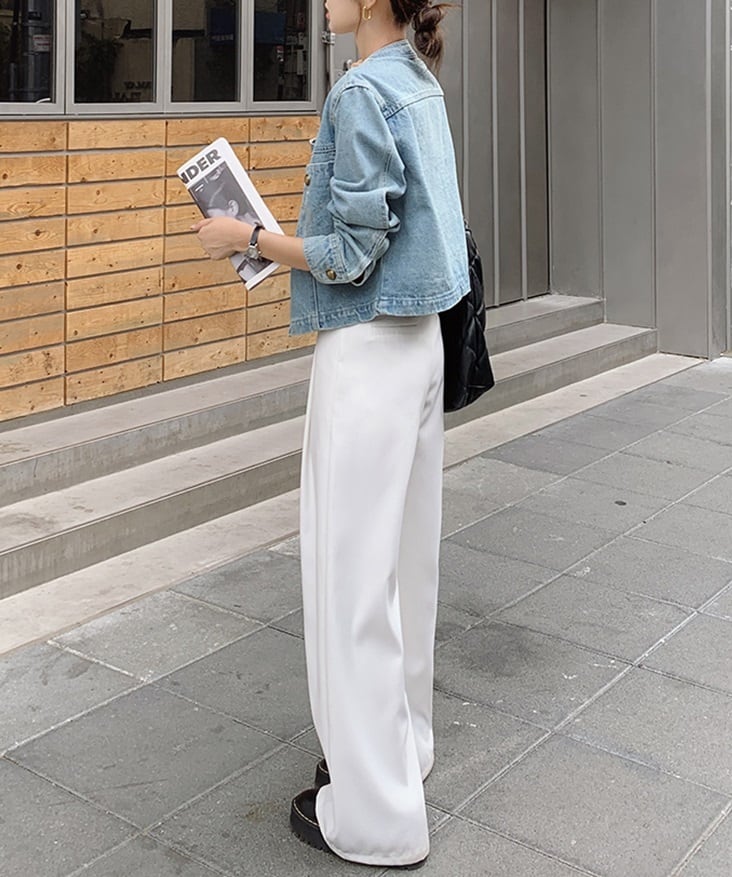 おしゃれで上品なデニムジャケット、それがこのゴールドボタンデニムジャケットです。シンプルなデザインながらも、ゴールドのボタンがアクセントになり、大人可愛い雰囲気を演出します。ラウンドネックで襟なしのデザインは、カジュアルからきれいめまで幅広いスタイリングに対応しています。