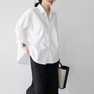 シンプルで上品ながらも遊び心を感じるアシメデザインの長袖シャツブラウスが登場しました。ドロップショルダーでゆったりとしたシルエットが特徴で、角襟と前開きデザインがおしゃれなアクセントに。2タイプの裾丈が選べる嬉しいアイテムです。