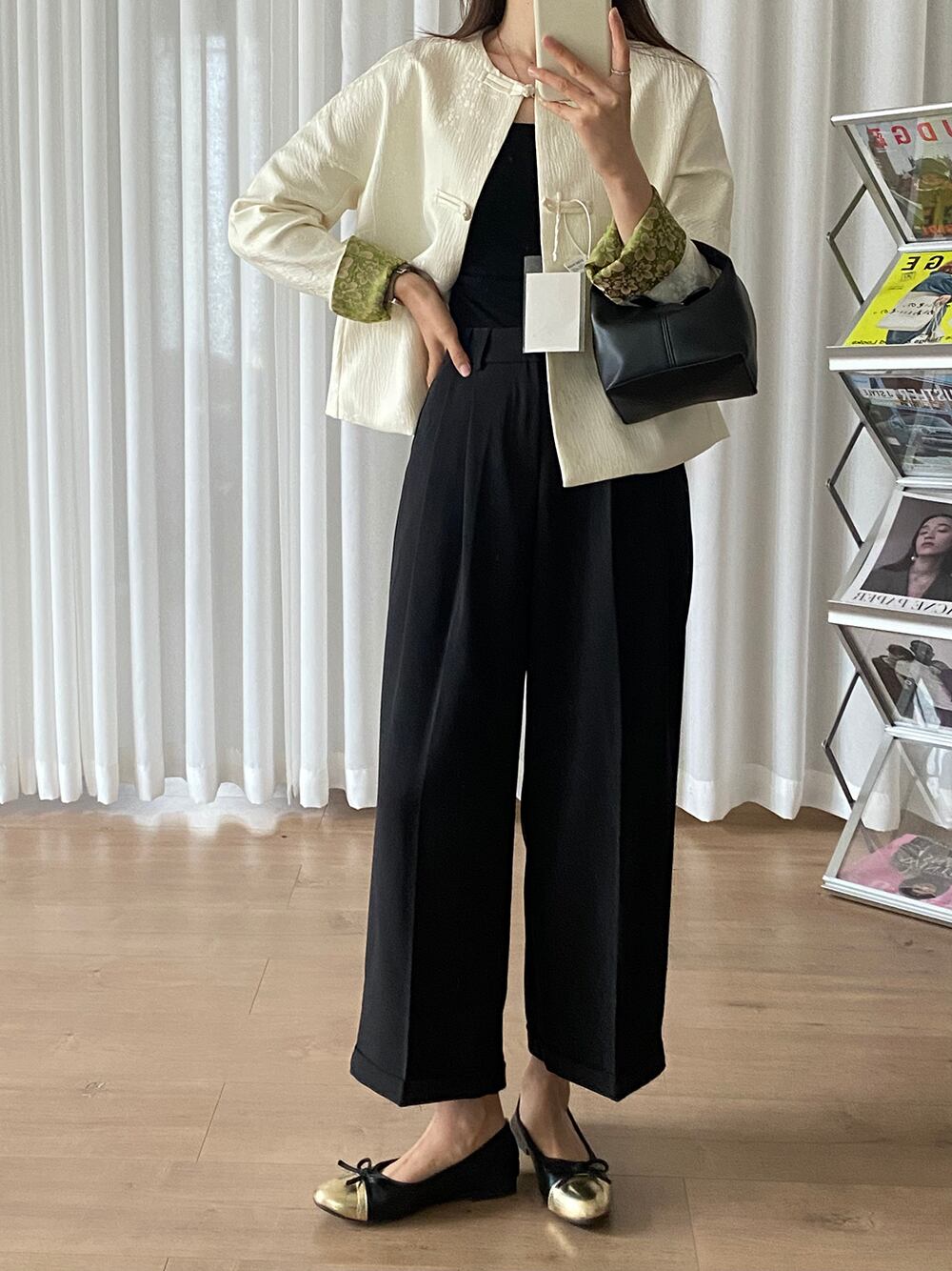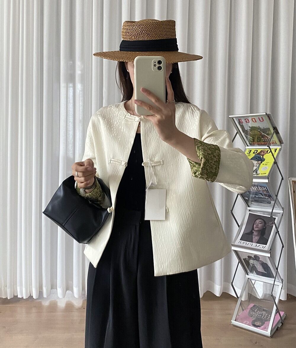 袖裏フラワープリント 植物柄地模様入り チャイナボタン ノーカラージャケット レディース ジャケット アウター 上着 羽織り ショート ミディアム丈 長袖 クルーネック 襟なし ノーカラー 前開き ボタン かわいい 大人可愛い きれいめ シンプル カジュアル 上品 おしゃれ こなれ感 アジアン オリエンタル 花柄 ボタニカル 春 夏 ママ 女の子 OL 通勤 学生 学校 通学 デート お出かけ 女子会 休日 普段使い 着回し レイヤード S M L XL ゆったり 黒 ブラック オフホワイト オフ白