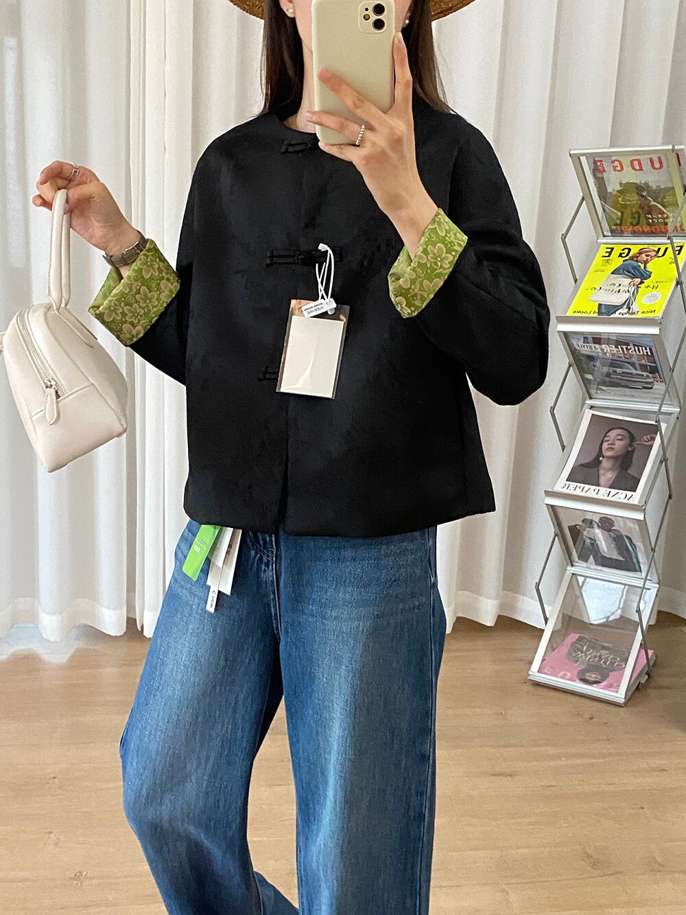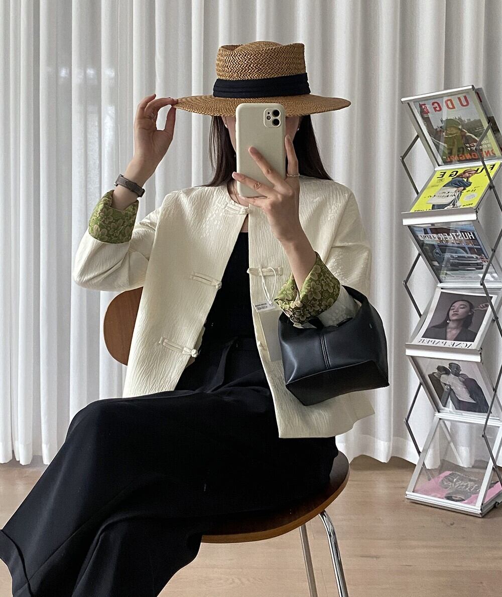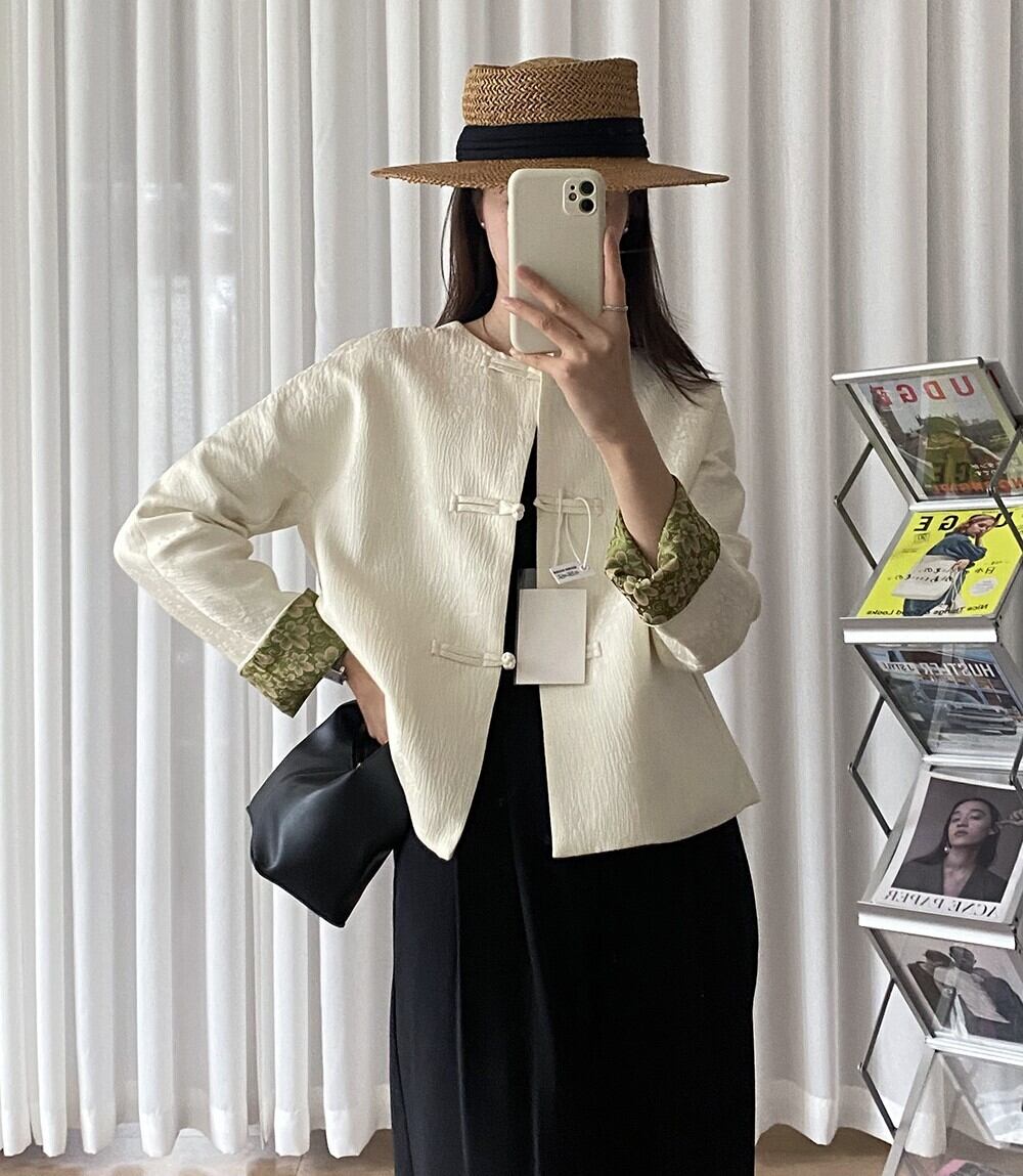チャイナボタンがポイントの植物柄地模様入りノーカラージャケットです。袖裏に花柄生地をあしらったデザインで、グリーンベースのフラワープリントカフスが華やかな印象。大人可愛い雰囲気を演出しつつ、アジアンテイストも感じさせる一着です。