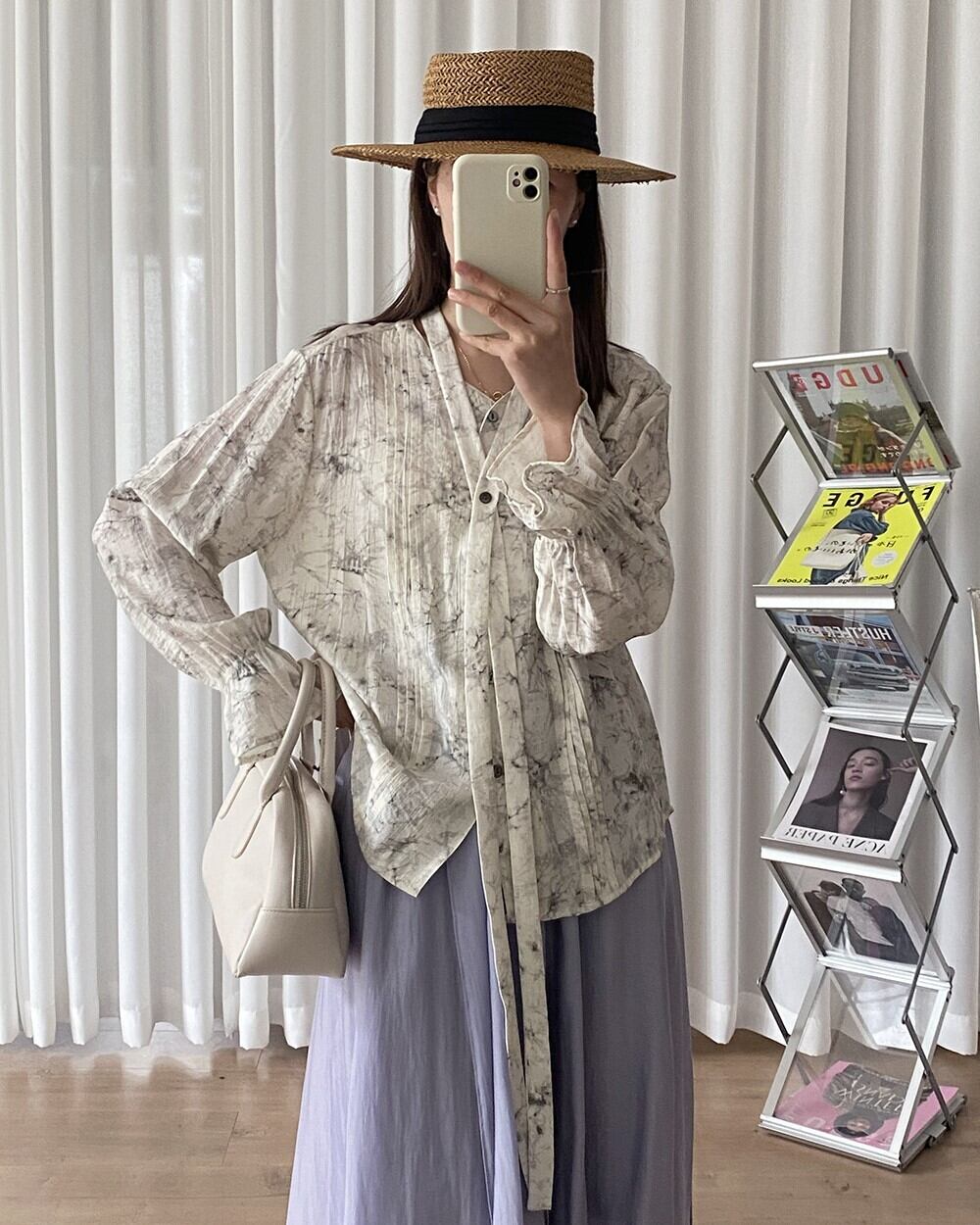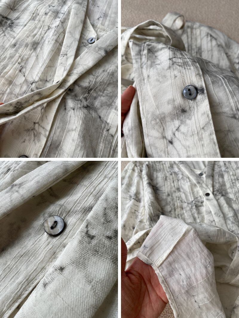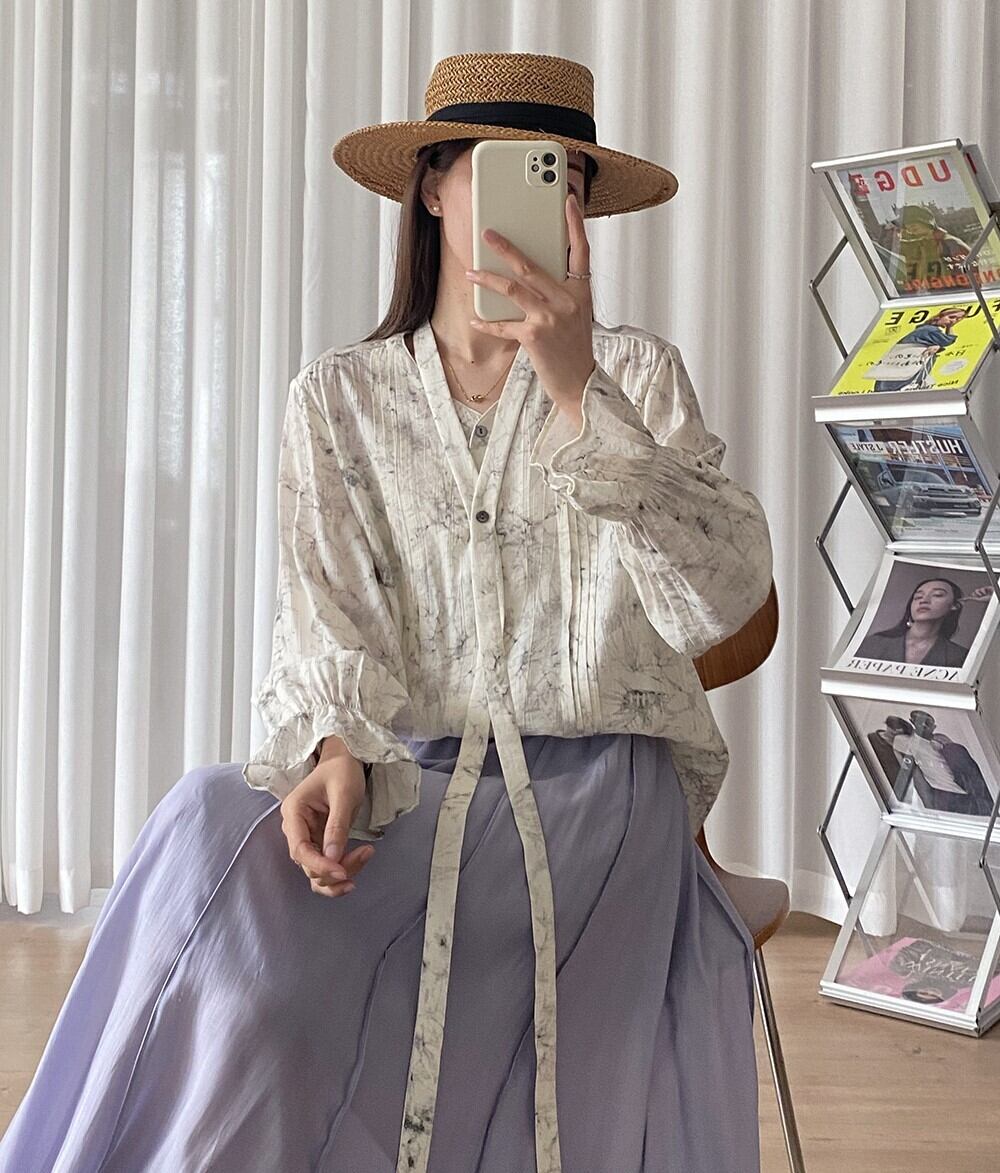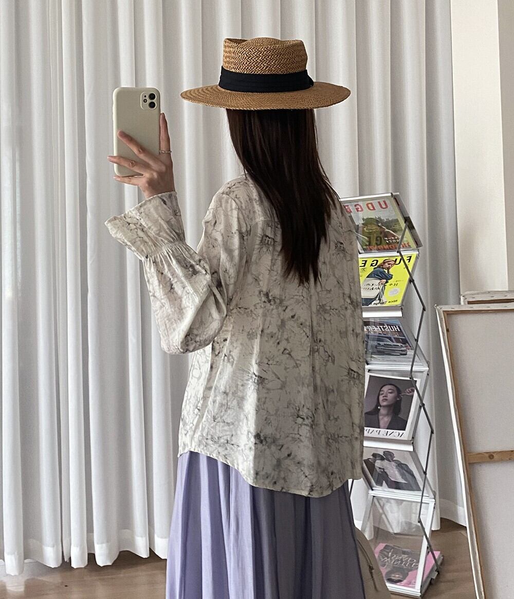 モノトーンカラーのタイダイ柄で雰囲気ある着こなしが楽しめるロングリボン付きのピンタックブラウスです。ゆったりオーバーサイズシルエットで体型カバーでき、手首にゴム入りのキャンディスリーブデザインが大人可愛く、リラックスした雰囲気を演出しながら、上品でおしゃれな着こなしを叶えます。