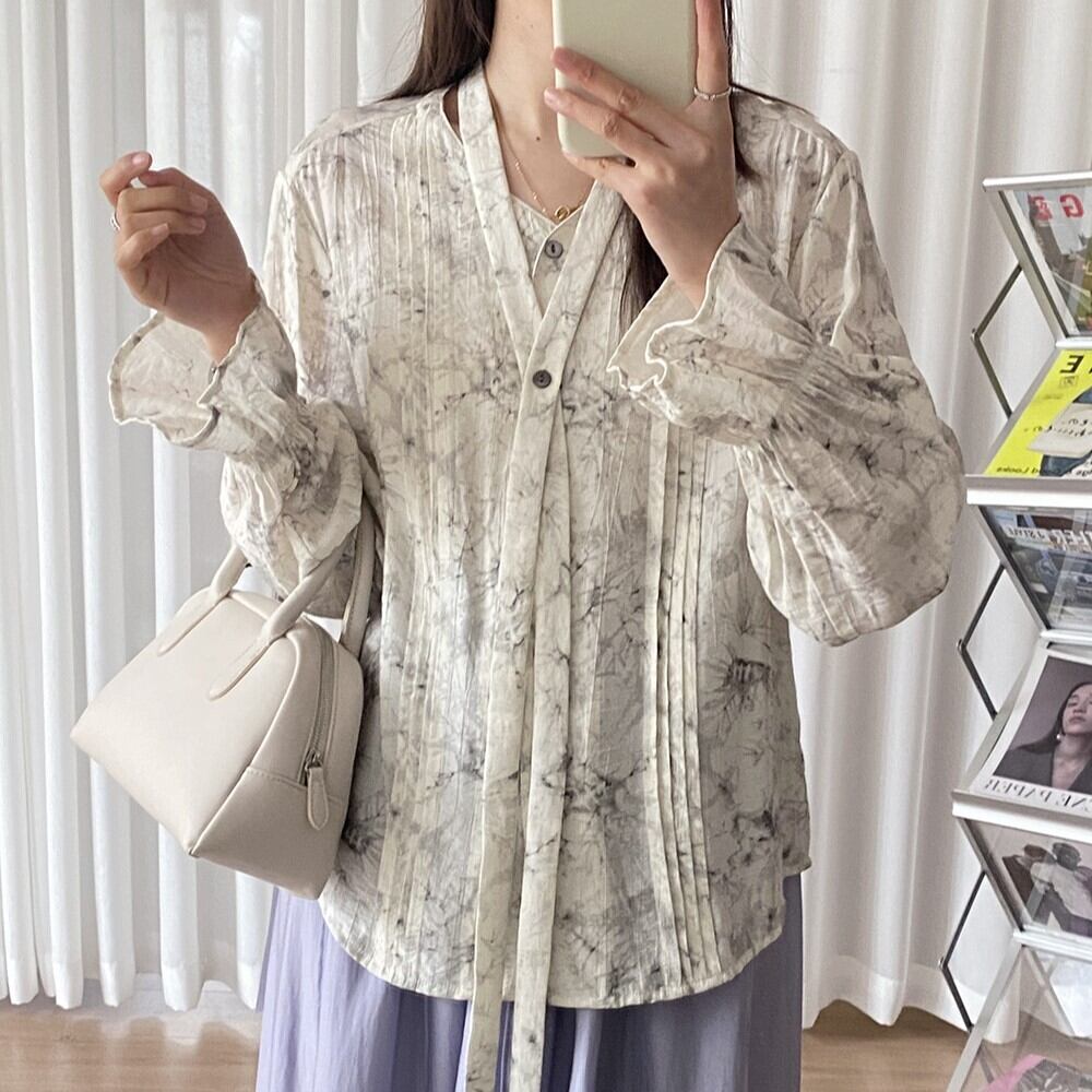 ロングリボン付き タイダイ柄 レディース トップス ブラウス ミディアム丈 長袖 ドロップショルダー キャンディスリーブ Vネック 襟なし オーバーサイズ 前開き ピンタック リボンタイ かわいい 大人可愛い きれいめ シンプル カジュアル 上品 おしゃれ こなれ感 個性的 存在感 ナチュラル リラックス 総柄 春 秋 ママ 女の子 学生 学校 通学 デート お出かけ 女子会 休日 ショッピング カフェ 韓国 オルチャン コーデ 体型カバー 普段使い ゆったり ゆる フリーサイズ グレー モノトーン