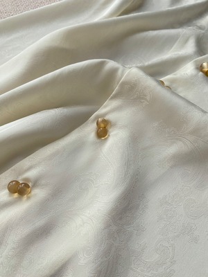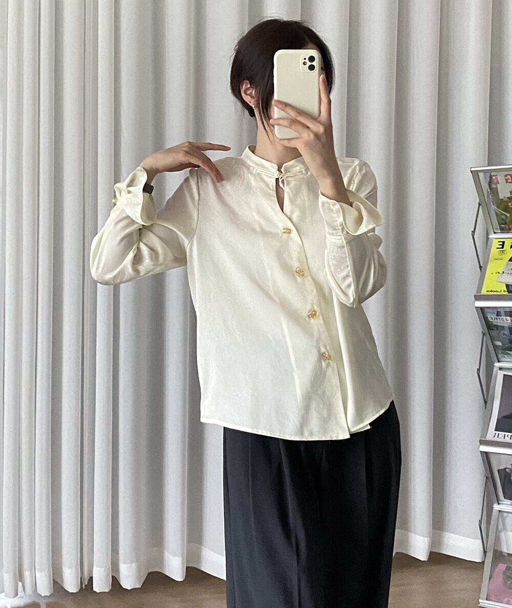 やや光沢のある生地にペイズリー柄の地模様が入った、首元のチャイナボタンがポイントのブラウスです。前立て部分のつやのあるダブルボタンや手首を絞ったキャンディスリーブが大人可愛く、チャイナ風のテイストが個性を引き立てます。シンプルな中にも華やかさを感じられるアイテムはほどよいゆとりがあるシルエットで1枚でおしゃれ度をアップできるアイテムです。自分らしさを表現したい女性におすすめ。