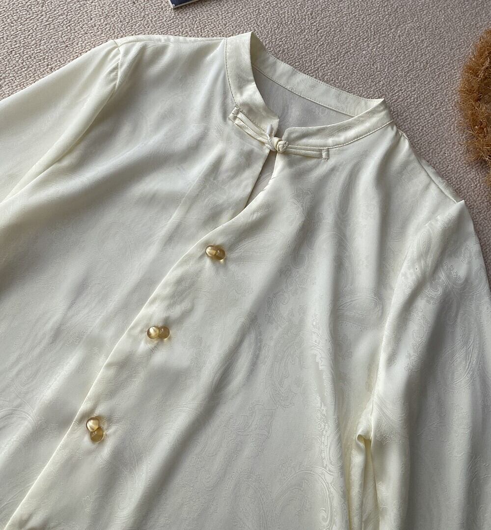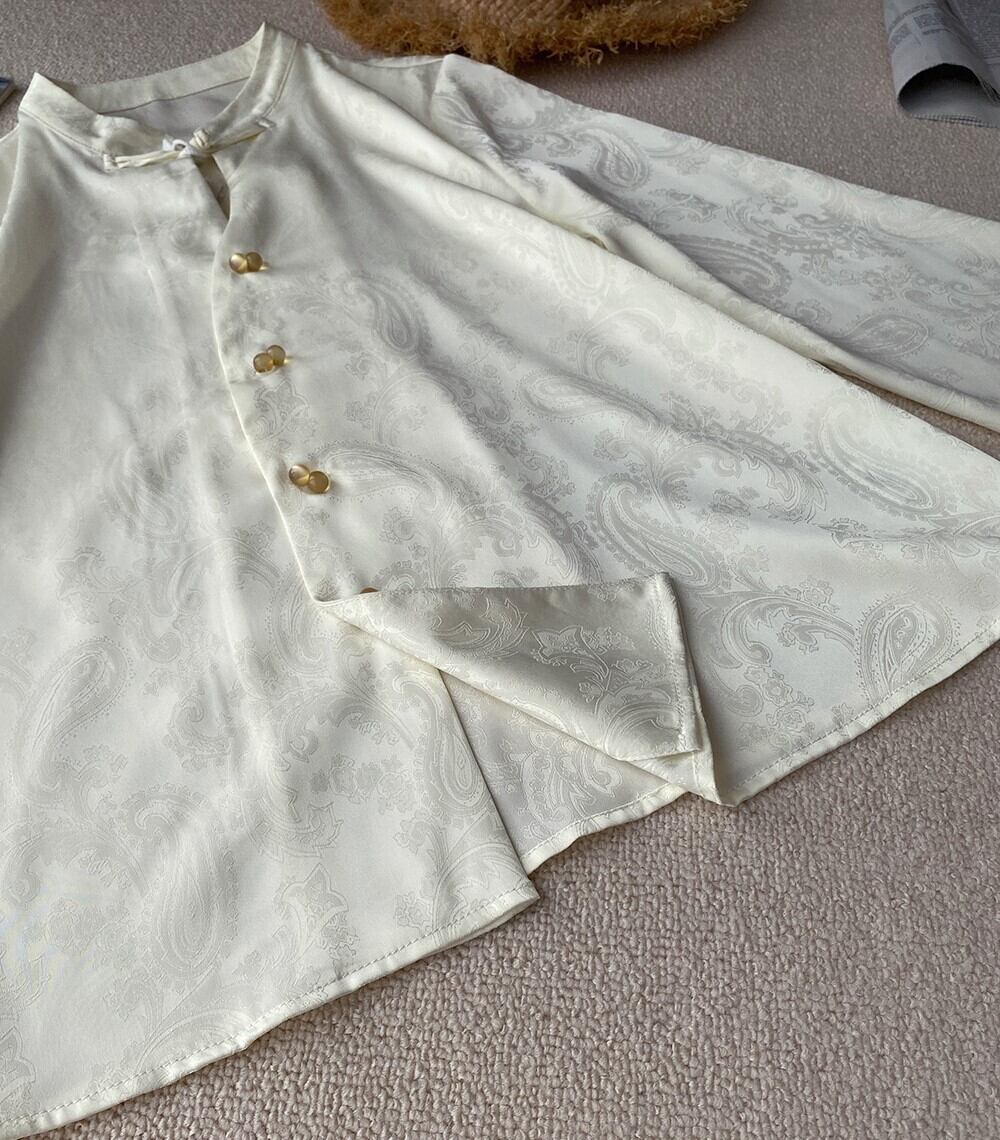 ペイズリー柄地模様 首元チャイナボタン レディース トップス ブラウス ミディアム丈 長袖 キャンディスリーブ 襟付き スタンドカラー 前開き 異国風 つやボタン ダークジャガード 中華風 かわいい 大人可愛い きれいめ シンプル 上品 おしゃれ アジアン エキゾチック こなれ感 個性的 エレガント 総柄 春 夏 ママ 女の子 ミセス OL 通勤 学生 学校 通学 デート お出かけ イベント レストラン 女子会 休日 会食 お呼ばれ 体型カバー 普段使い 着回し インスタ映え S M L XL ゆったり
