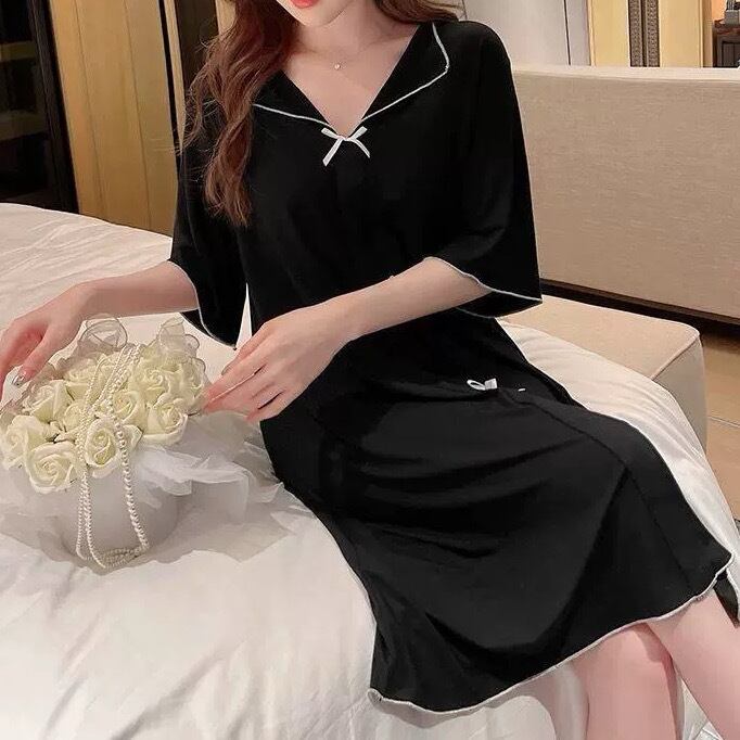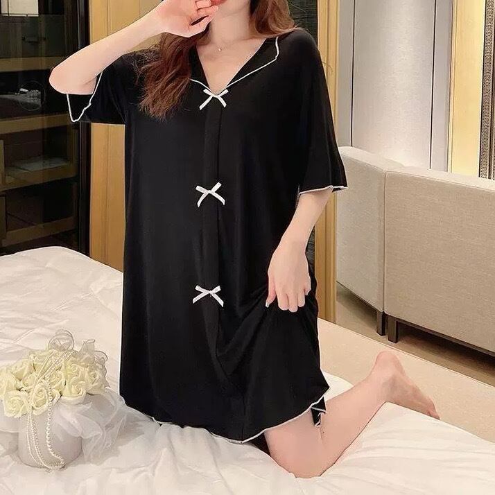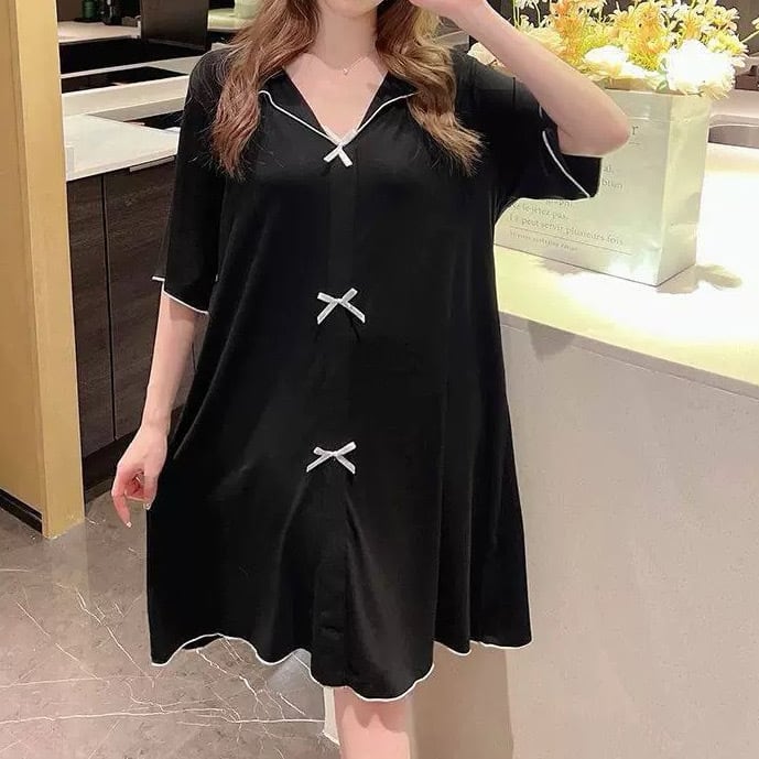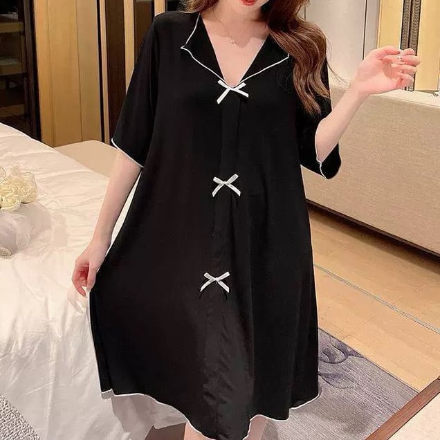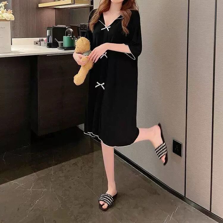 レディース ワンピース Tシャツワンピ ルームウェア パジャマ 部屋着 オールインワン 寝巻き Tシャツ 膝丈 半袖 5分袖 Vネック 襟付き セミフレア Aライン フェミニン リボン 伸縮性 配色 薄手 かわいい 大人可愛い ラフ ガーリー ルーズ ラブリー キュート プリンセス ロマンティック 無地 春 夏 ママ マタニティ お泊まり 旅行 休日 モノトーン 韓国 オルチャン コーデ 楽ちん 体型カバー 普段使い モテ サイズ M L XL 2XL 3XL 大きいサイズ ゆったり ゆる 黒 ブラック
