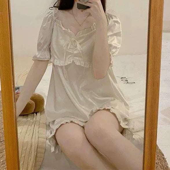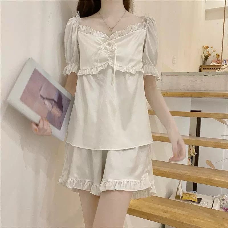 レディース トップス パンツ ボトムス 部屋着 セットアップ 寝巻き ネグリジェ ショートパンツ ミニ ショート 半袖 パフスリーブ フリル袖 バルーン袖 Vネック スクエアネック セミフレア セパレート フェミニン フリル リボン ギャザー 薄手 かわいい 大人可愛い おしゃれ ガーリー ラブリー キュート プリンセス ラグジュアリー ロマンティック 無地 春 夏 お泊まり 休日 韓国 オルチャン コーデ 楽ちん 美脚 脚長 普段使い モテ サイズ S M L XL 2XL 大きいサイズ アプリコット