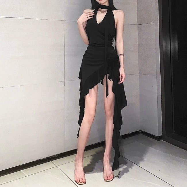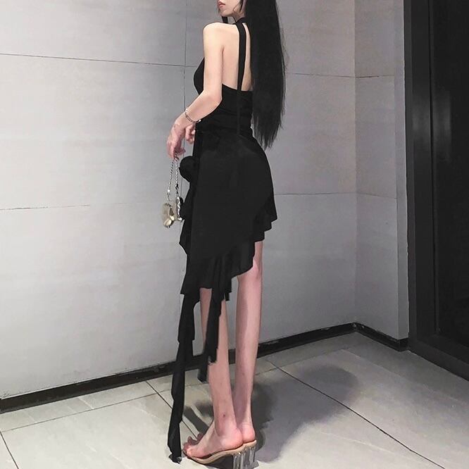 ドレス パーティードレス カクテルドレス イブニングドレス ロング丈 ノースリーブ フリル Vネック アシンメトリー スリム 細身 ハイウエスト きれいめ 大人 上品 お洒落 かっこいい レトロ 大人女子 こなれ感 クール セクシー エレガント 主役級 存在感 フォーマル クラシック 20代 30代 40代 レディース 韓国系 オルチャン ファッション コーデ スタイル 美脚 脚長 高見え 格上げ 夏 結婚式 二次会 披露宴 お呼ばれ パーティー キャバ嬢 インスタ映え S M L レッド ブラック