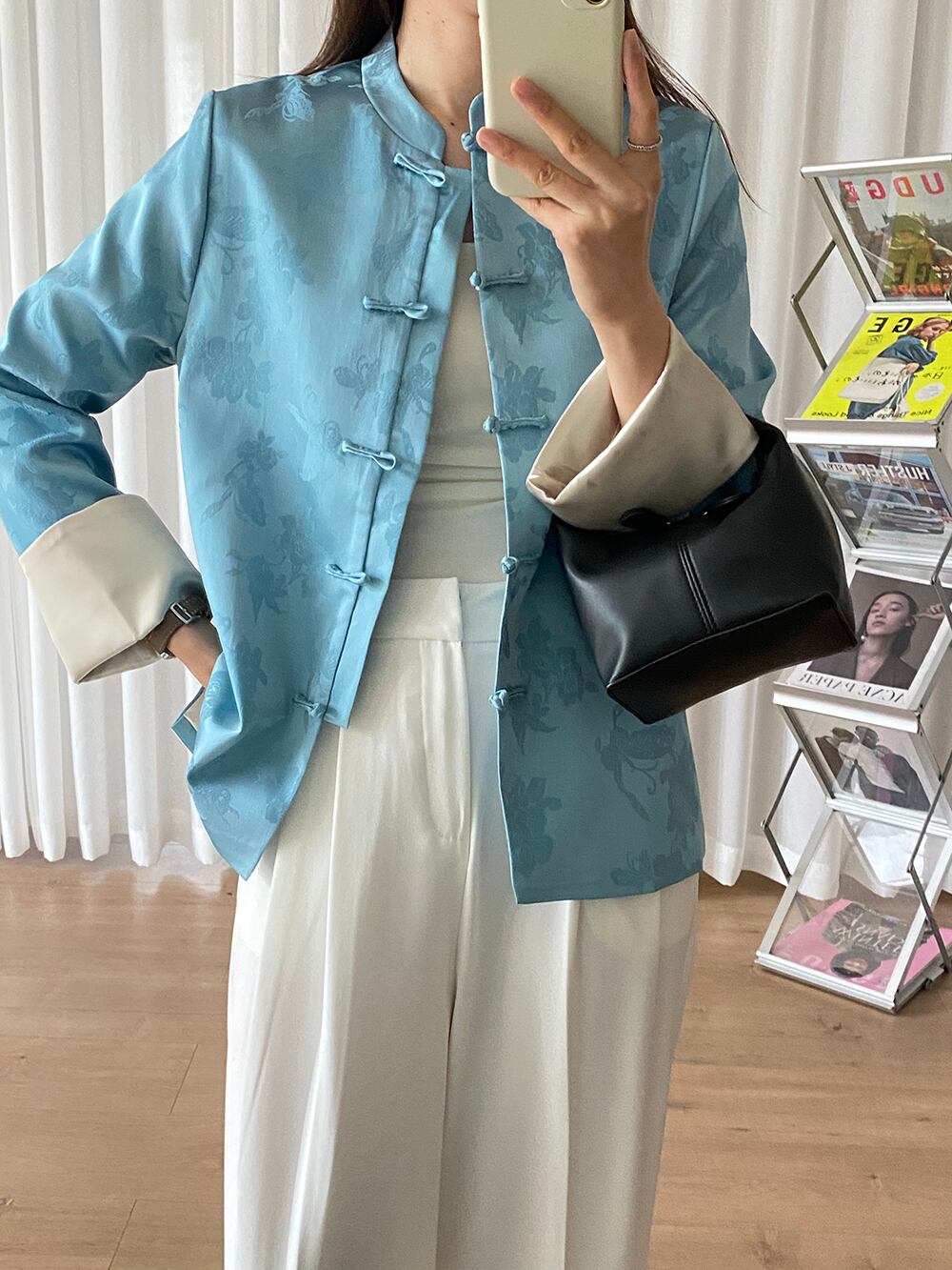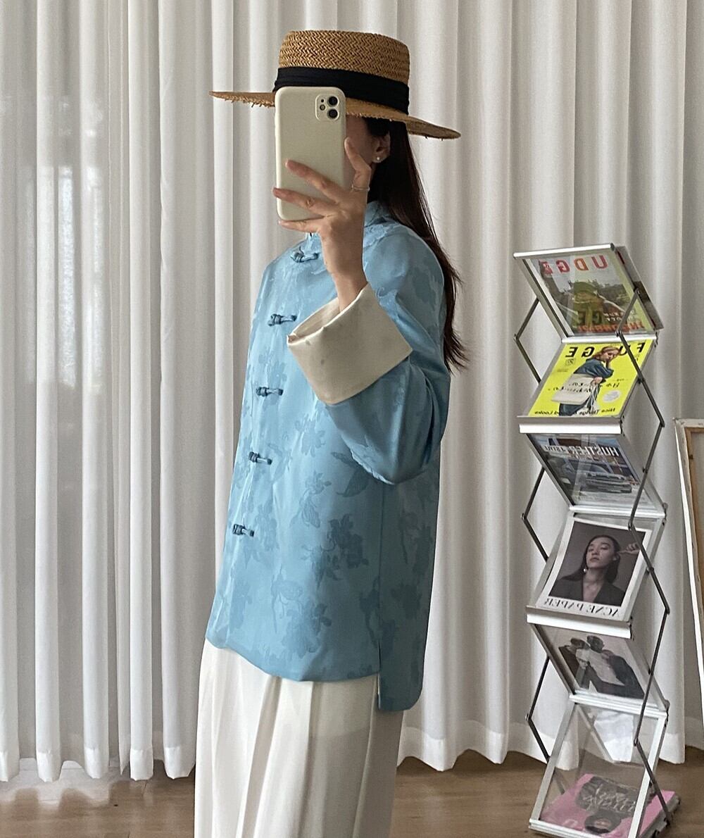 バタフライ&フラワー柄地模様が入った光沢感のある生地で仕立てた、チャイナボタンが可愛いマオカラージャケットです。袖口のバイカラー切り替えデザインとアンバランスヘムがおしゃれで、着るだけでお洒落上級者の仲間入りができそう。ルーズにならない程度のほどよいゆったり感で重ね着コーデしやすくなっています。