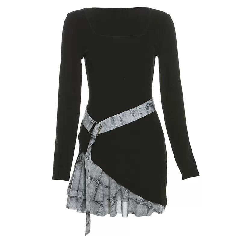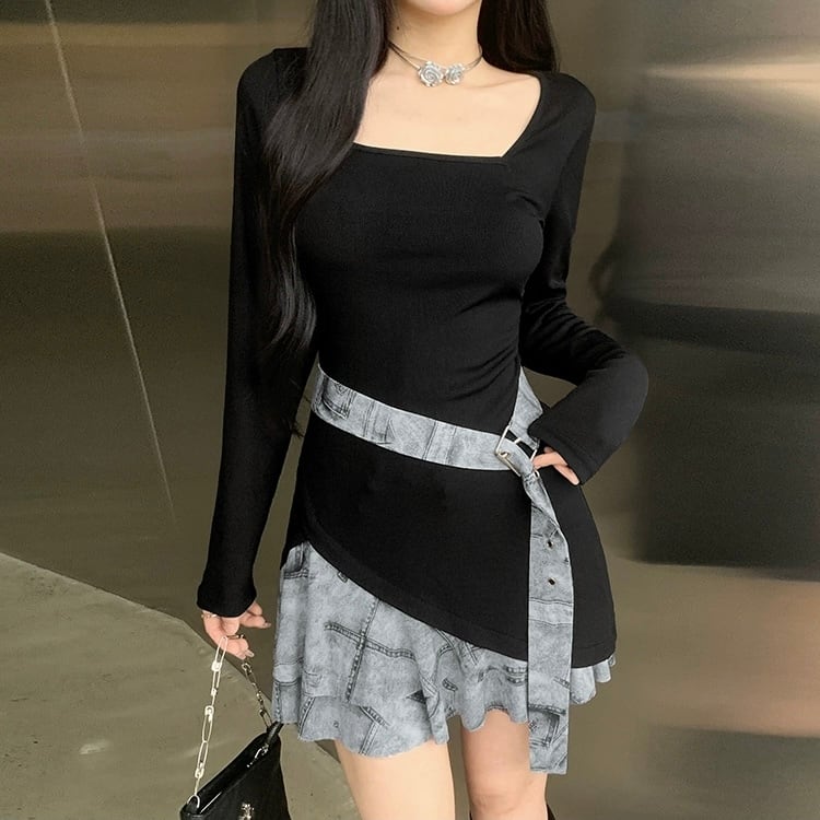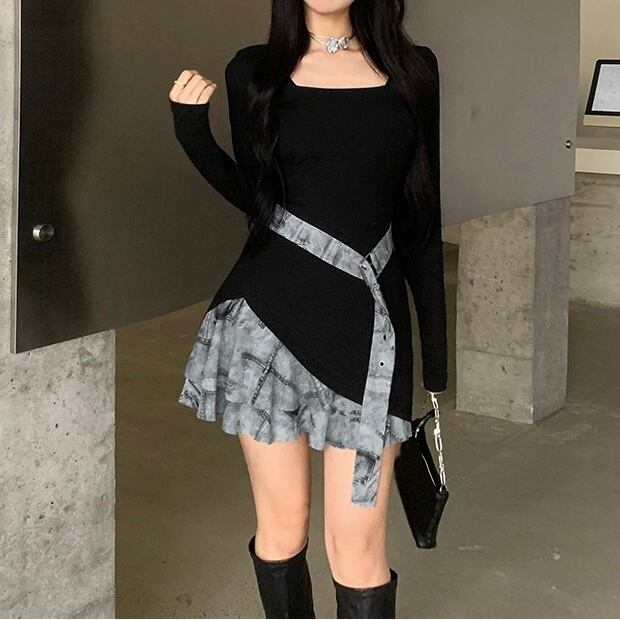 ワンピース レディース 長袖 スクエアネック フリル アシンメトリー ハイウエスト スリム 細身 きれいめ 上品 おしゃれ お洒落 大人可愛い 大人女子 かっこいい カジュアル ラブリー キュート シンプル レトロ 主役級 存在感 こなれ感 抜け感 秋 10代 20代 お出かけ デート 女子会 アウトドア ショッピング 旅行 高原 お泊まり 休日 普段使い デイリー 着回し 韓国 韓国系 オルチャン ファッション コーデ トレンド 流行 スタイルアップ 脚長 美脚 インスタ映え S M L ブラック