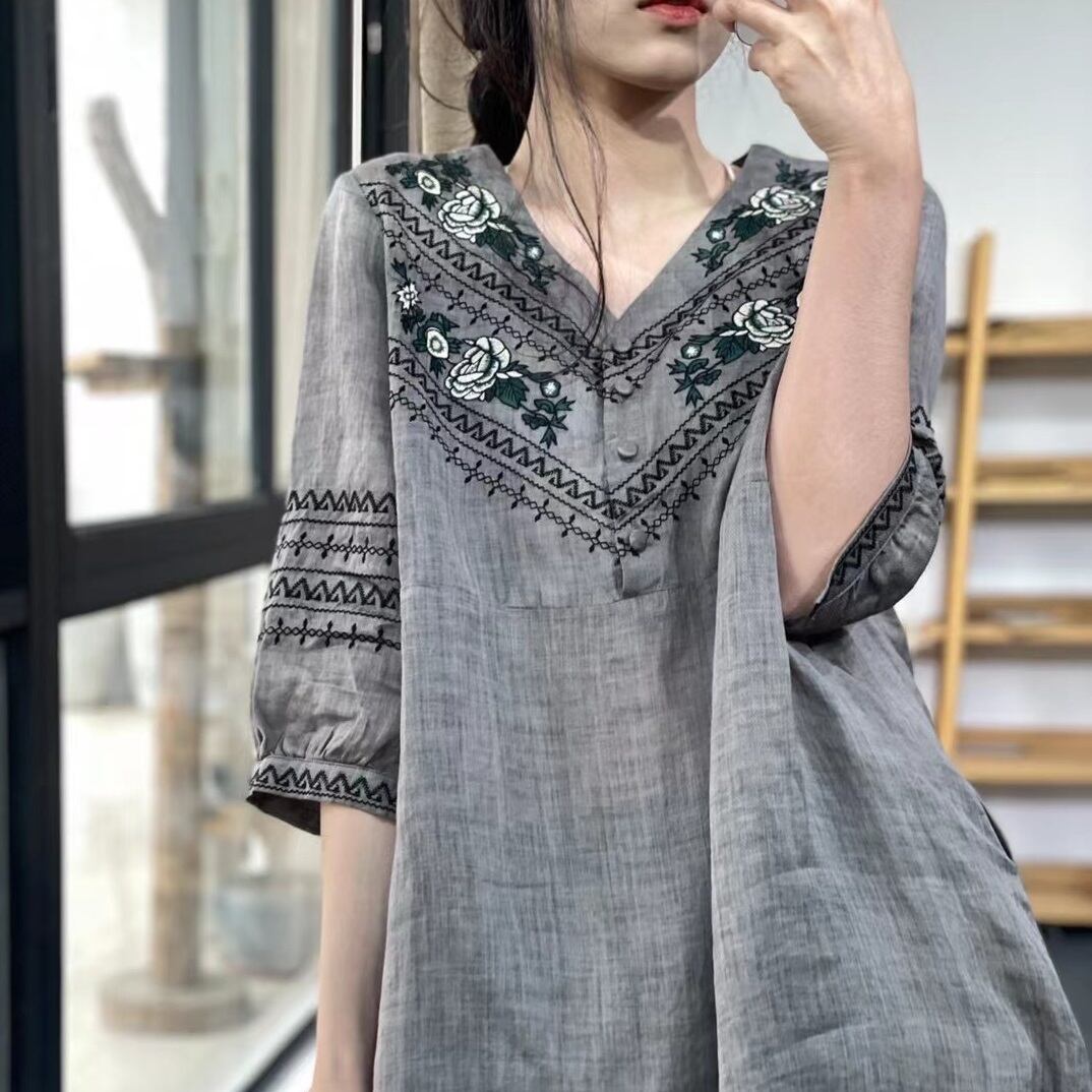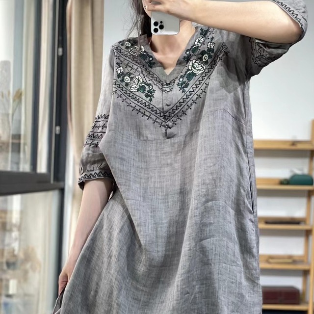 レディース トップス ワンピース シャツ シャツワンピ 膝丈 ミモレ 半袖 Vネック 襟なし ワイド Aライン フェミニン 刺繍 ボタン リネン かわいい 大人可愛い シンプル カジュアル おしゃれ レトロ こなれ感 ラフ ルーズ 個性的 モダン ナチュラル 花柄 フラワー 夏 授業参観 ママ マタニティ 通勤 お出かけ レストラン 公園 女子会 休日 ショッピング 重ね着 楽ちん 体型カバー 普段使い 着回し M L XL 2XL ゆったり ゆる 白 ホワイト グレー ライトグレー アプリコット