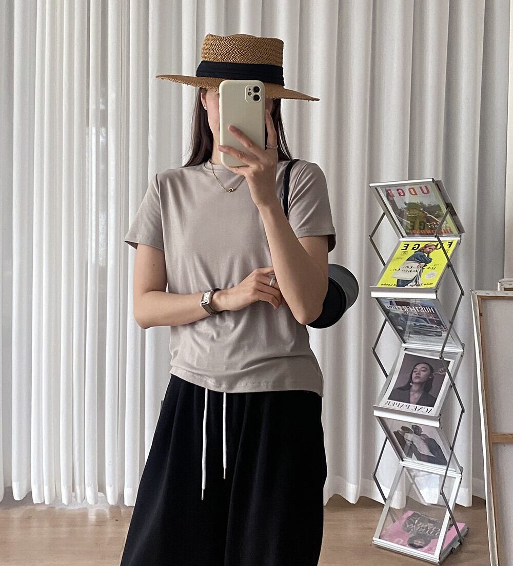 大人カジュアルにぴったりなシンプルデザインのクルーネックTシャツ。バックネックにあしらったシェルボタンがアップヘアにした際にさりげないポイントになります。柔らかめの素材感で着心地がよく、合わせやすい落ち付いたカラー展開も魅力。