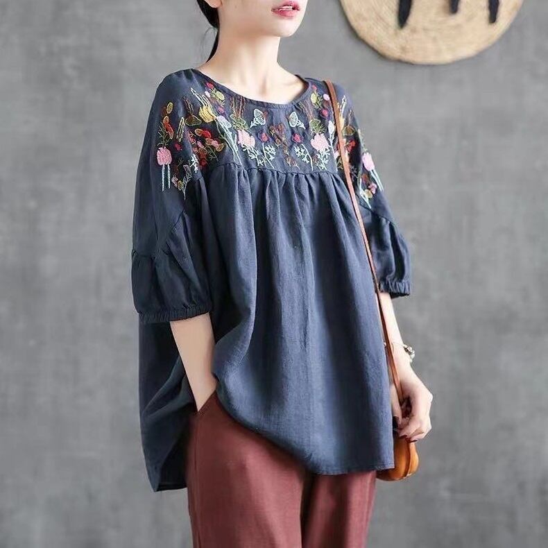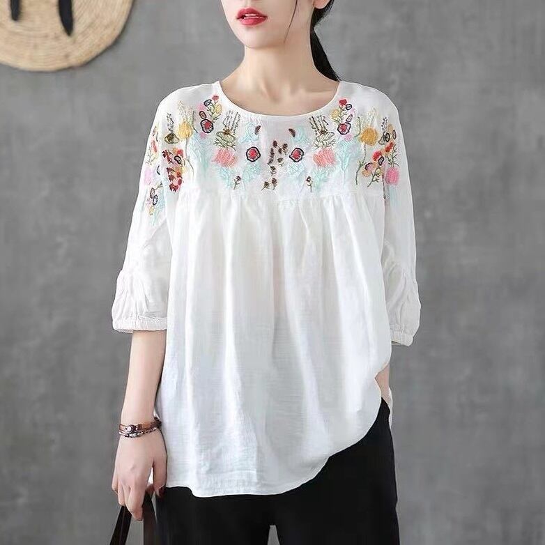 レディース トップス シャツ 7分袖 ボリューム袖 ラウンドネック 刺繍 リネン 綿 麻 かわいい 大人可愛い シンプル カジュアル レトロ こなれ感 ラフ ガーリー ルーズ 個性的 モダン 存在感 ナチュラル カラフル 花柄 フラワー 夏 授業参観 会議 MTG ミーティング ママ 通勤 デート お出かけ アウトドア レストラン 公園 女子会 休日 ショッピング カフェ 楽ちん 体型カバー 普段使い 着回し 清楚 L XL 2XL 大きいサイズ ビッグ ゆったり ゆる 白 ホワイト オレンジ ブルー