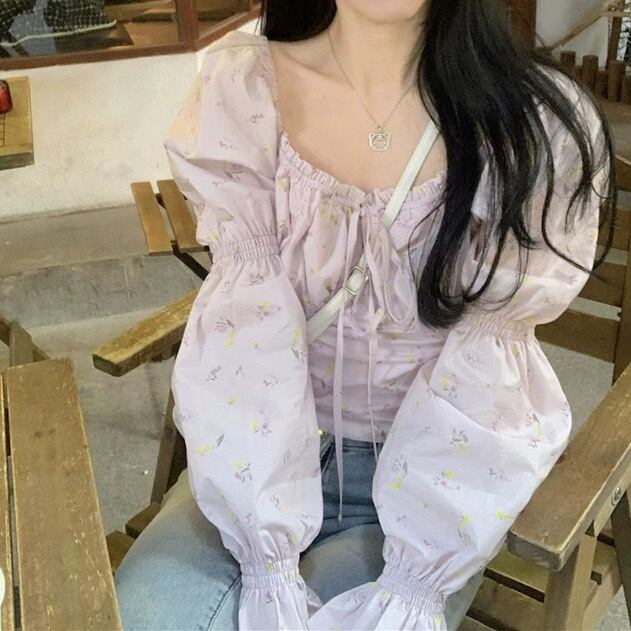 レディース トップス シャツ ブラウス プルオーバー ショート クロップド丈 長袖 パフスリーブ ボリューム袖 フレアスリーブ フリル袖 バルーン袖 スクエアネック フレア スリム 細身 切り替え フェミニン フリル リボン ウエストマーク 切り替えデザイン 薄手 かわいい 大人可愛い おしゃれ ガーリー ラブリー キュート プリンセス 花柄 フラワー 春 学生 デート お出かけ 旅行 公園 女子会 休日 ショッピング お花見 韓国 オルチャン コーデ 普段使い モテ サイズ展開 S M L パープル