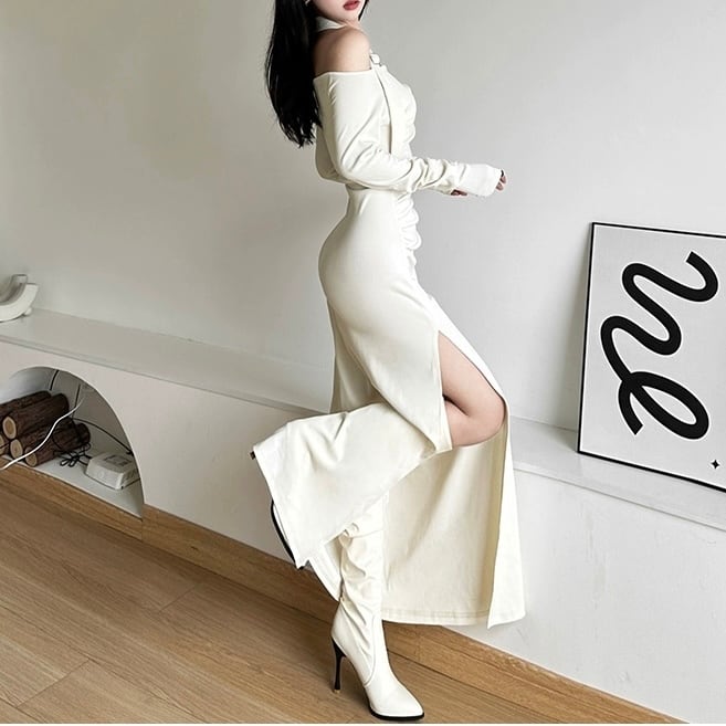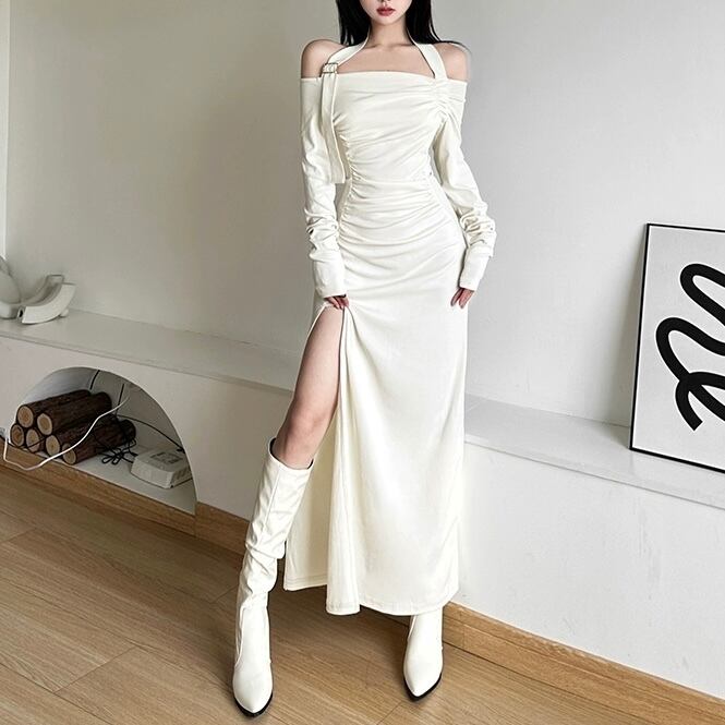 ドレス パーティードレス カクテルドレス イブニングドレス ロング丈 長袖 ホルターネック ワンショルダー サイドスリット スリット スリム 細身 無地 ハイウエスト きれいめ 大人 上品 お洒落 かっこいい レトロ 大人女子 こなれ感 クール セクシー エレガント 主役級 存在感 フォーマル クラシック 20代 30代 40代 レディース 韓国系 オルチャン ファッション コーデ スタイル 美脚 脚長 高見え 格上げ 秋 二次会 お呼ばれ パーティー キャバ嬢 クラブ S M L ホワイト ブラック