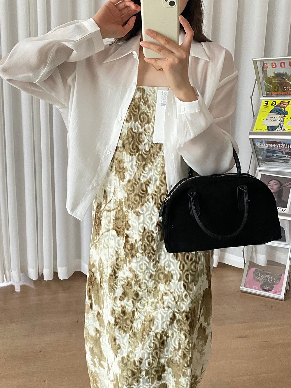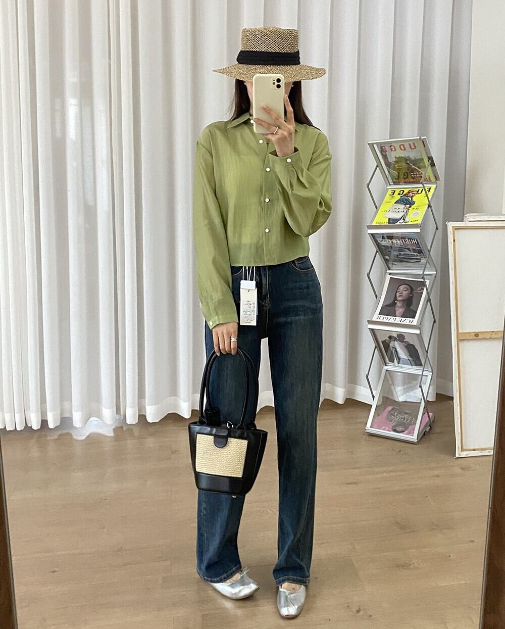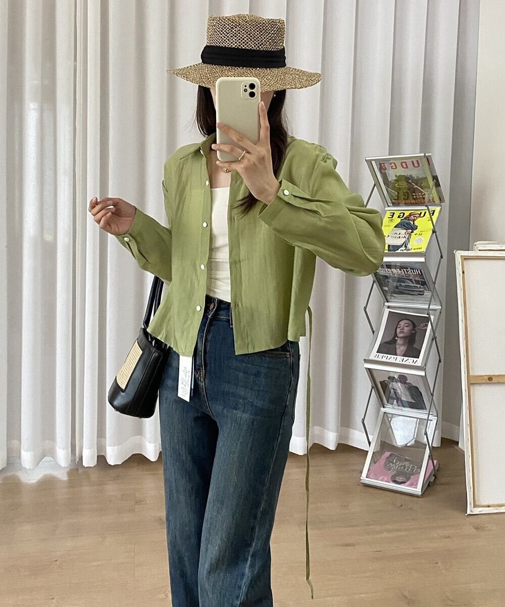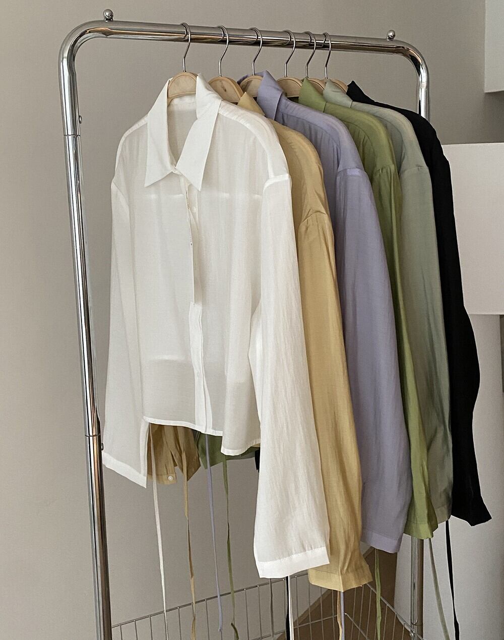 後ろ裾が前裾より短く、後ろ腰で細いリボンを結ぶデザインのオーバーサイズブラウスです。ゆるっとリラックス感がありながら後ろ姿に一工夫あり、着るだけでおしゃれ度がアップする優れものです。色々なボトムスとバランスよく決まり脚長効果があるショート丈で、暑い時期の日差し対策や冷房対策用の羽織りにもぴったり。淡い色は特に透け感があるため、透けを意識したレイヤードコーデがおすすめです。