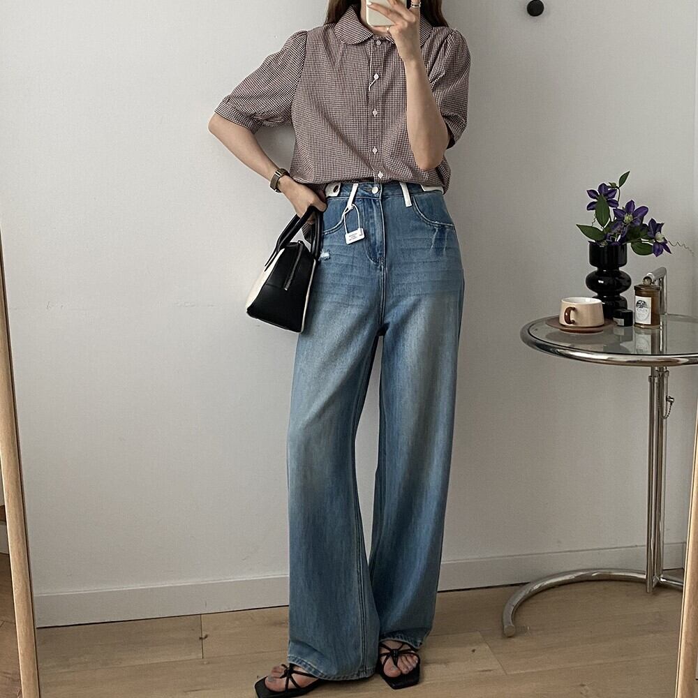 ウォッシュジーンズ ヨモギ抗菌 ベルト部白配色 ワイドレッグパンツ レディース パンツ ボトムス Gパン ストレートパンツ デニムパンツ フルレングス ロング ワイド ストレート ダメージ加工 ファスナー ポケット ハイウエスト ブルーデニム シンプル カジュアル おしゃれ かっこいい こなれ感 ボーイッシュ 無地 春 夏 秋 冬 オールシーズン シーズンレス ママ 女の子 学生 学校 通学 デート お出かけ 旅行 公園 女子会 休日 体型カバー 脚長 普段使い 着回し S M L XL デニムブルー