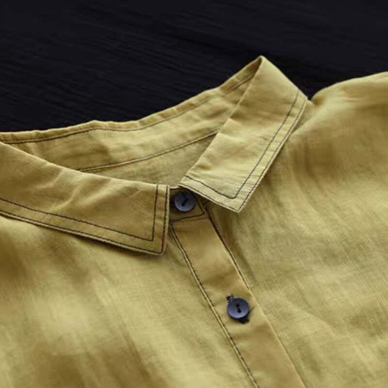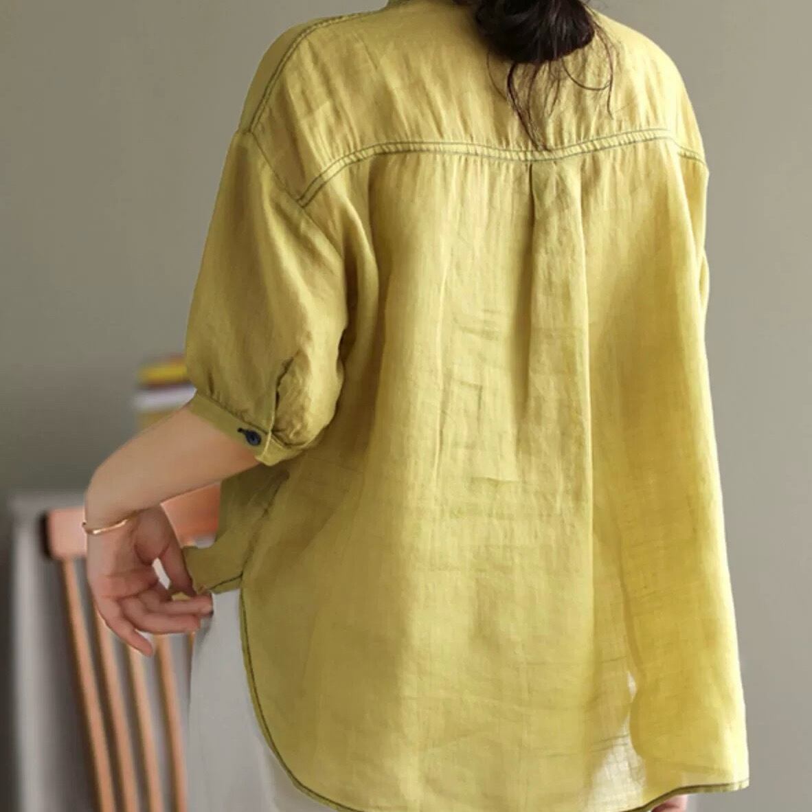 レディース トップス シャツ 羽織 前開き 半袖 5分袖 襟付き ポロカラー ストレート ポケット ボタン ステッチ ラウンドヘム 薄手 リネン コットン シンプル カジュアル おしゃれ レトロ こなれ感 ラフ ルーズ 抜け感 無地 春 夏 母の日 ママ お出かけ アウトドア キャンプ リゾート 旅行 海 ビーチ 公園 休日 ショッピング カフェ 韓国 コーデ コーディネート スタイル 普段使い 着回し サイズ M L XL 2XL 大きいサイズ ゆる 黄色 イエロー ネイビーブルー 紺 藍色 2色展開
