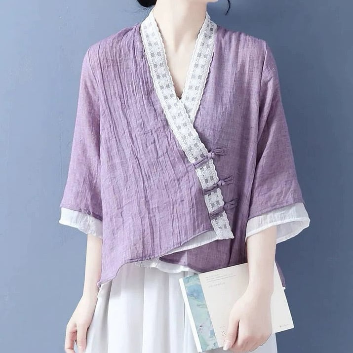 レディース トップス シャツ 羽織 半袖 7分袖 Vネック ストレート フェミニン レース 配色 薄手 リネン かわいい おしゃれ レトロ アジアン こなれ感 ラフ ガーリー ルーズ 個性的 抜け感 浴衣風 キュート 中華風 チャイナ風 無地 春 夏 母の日 お出かけ イベント リゾート 旅行 海 プール 公園 女子会 休日 ショッピング 韓国 コーデ 体型カバー 普段使い 着回し インスタ映え M L XL 2XL 3XL 大きいサイズ ゆったり ゆる ブルー ホワイト パープル ピンク ネイビーブルー