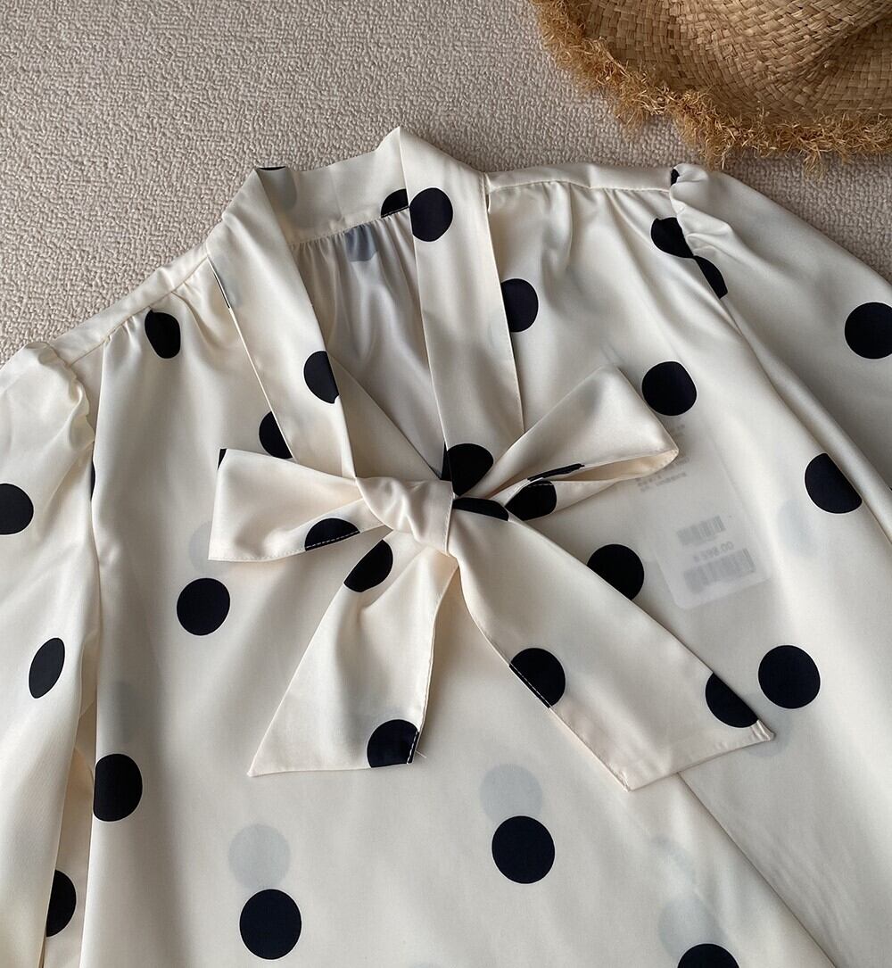 大きめドット柄 レディース トップス ブラウス ミディアム丈 長袖 ボリューム袖 パフスリーブ 袖口ギャザー 襟付き りぼんタイ ボウカラー フェミニン くるみボタン かわいい 大人可愛い きれいめ シンプル カジュアル 上品 おしゃれ レトロ 個性的 存在感 キュート ドット柄 水玉 総柄 春 秋 ママ 女の子 OL 通勤 学生 学校 通学 デート お出かけ レストラン 女子会 休日 ショッピング カフェ 韓国 オルチャン コーデ 体型カバー 普段使い インスタ映え S M L ゆったり ベージュ