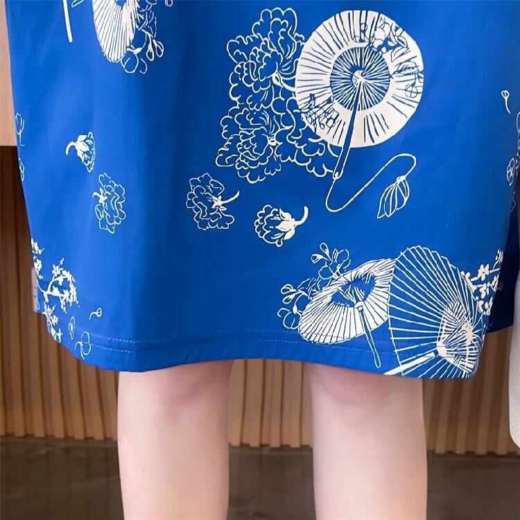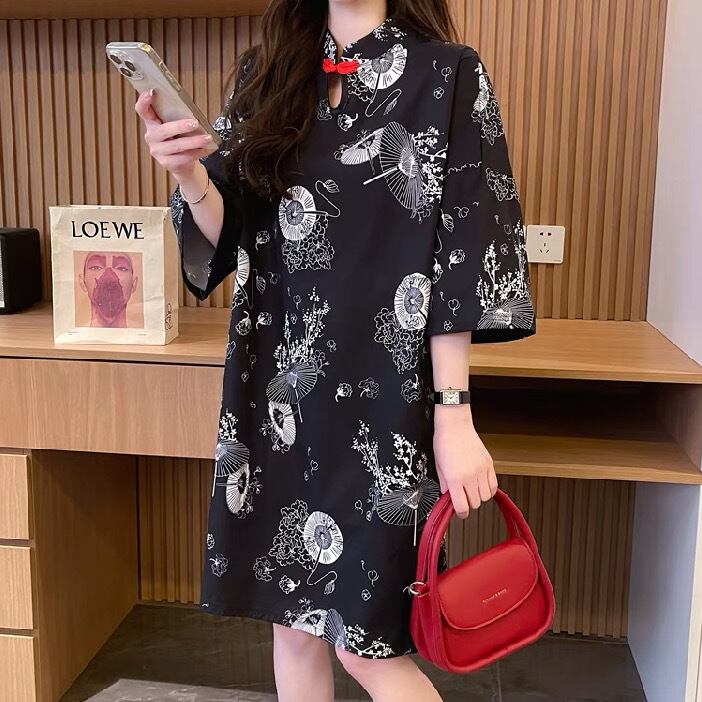 レディース ワンピース Tシャツ Tシャツワンピ 膝丈 半袖 5分袖 襟付き スタンドカラー ストレート 薄手 大人可愛い カジュアル おしゃれ かっこいい アジアン 中華風 中国風 チャイナ風 ラフ ルーズ 個性的 主役級 存在感 キュート プリント 総柄 春 夏 デート お出かけ イベント リゾート 旅行 海 プール ビーチ 公園 女子会 休日 ショッピング お揃い 双子 韓国 オルチャン コーデ 楽ちん 体型カバー 美脚 普段使い インスタ映え M L XL ゆったり ゆる 黒 ブラック ブルー 青