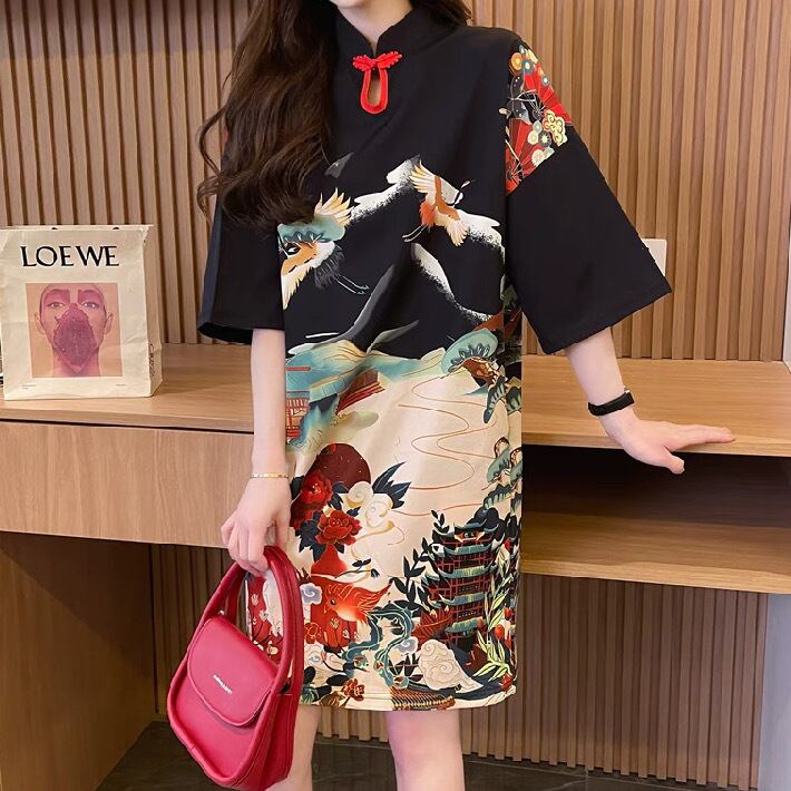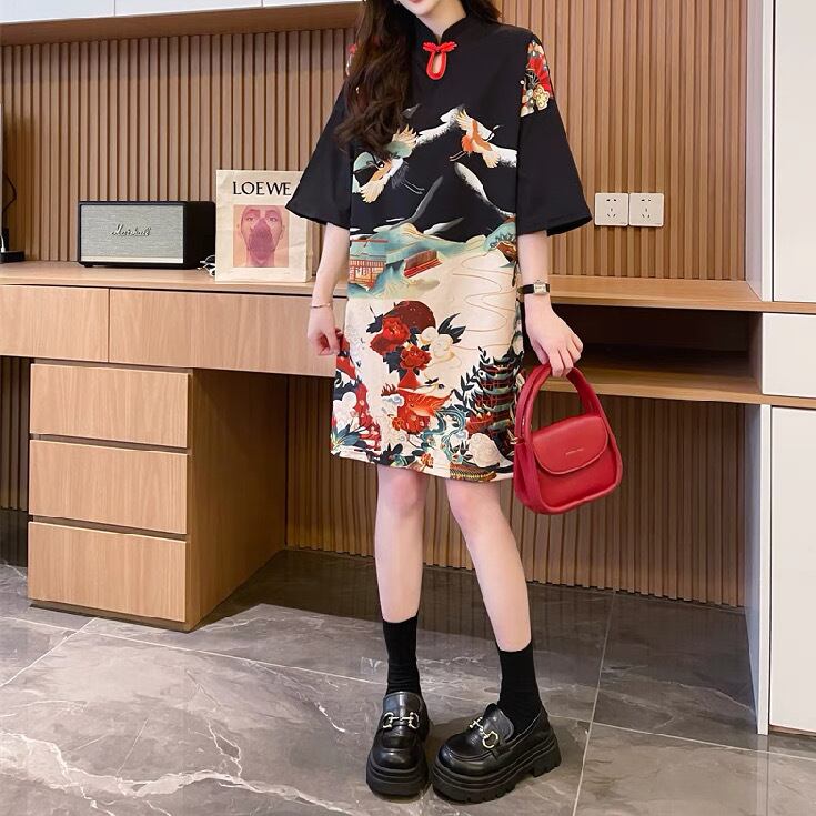 レディース ワンピース Tシャツ Tシャツワンピ 膝丈 半袖 5分袖 襟付き スタンドカラー ストレート 薄手 大人可愛い カジュアル おしゃれ かっこいい アジアン 中華風 チャイナ風 中国風 レトロ ラフ ルーズ 個性的 主役級 存在感 プリント 総柄 和柄 春 夏 デート お出かけ イベント リゾート 旅行 公園 女子会 休日 ショッピング お揃い 双子 韓国 オルチャン コーデ 楽ちん 体型カバー 美脚 普段使い インスタ映え サイズ展開 M L XL ゆったり ゆる 黒 ブラック グリーン 緑