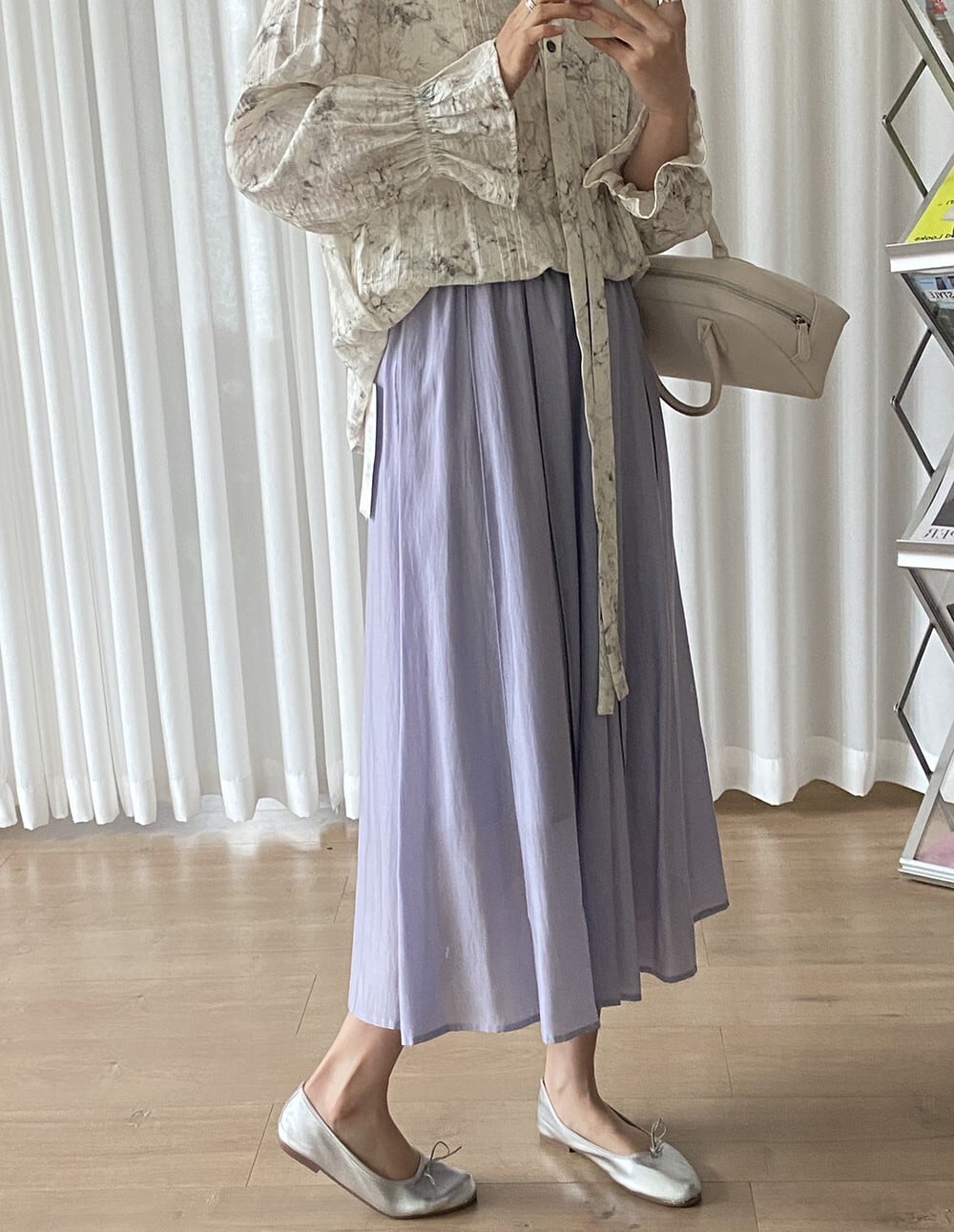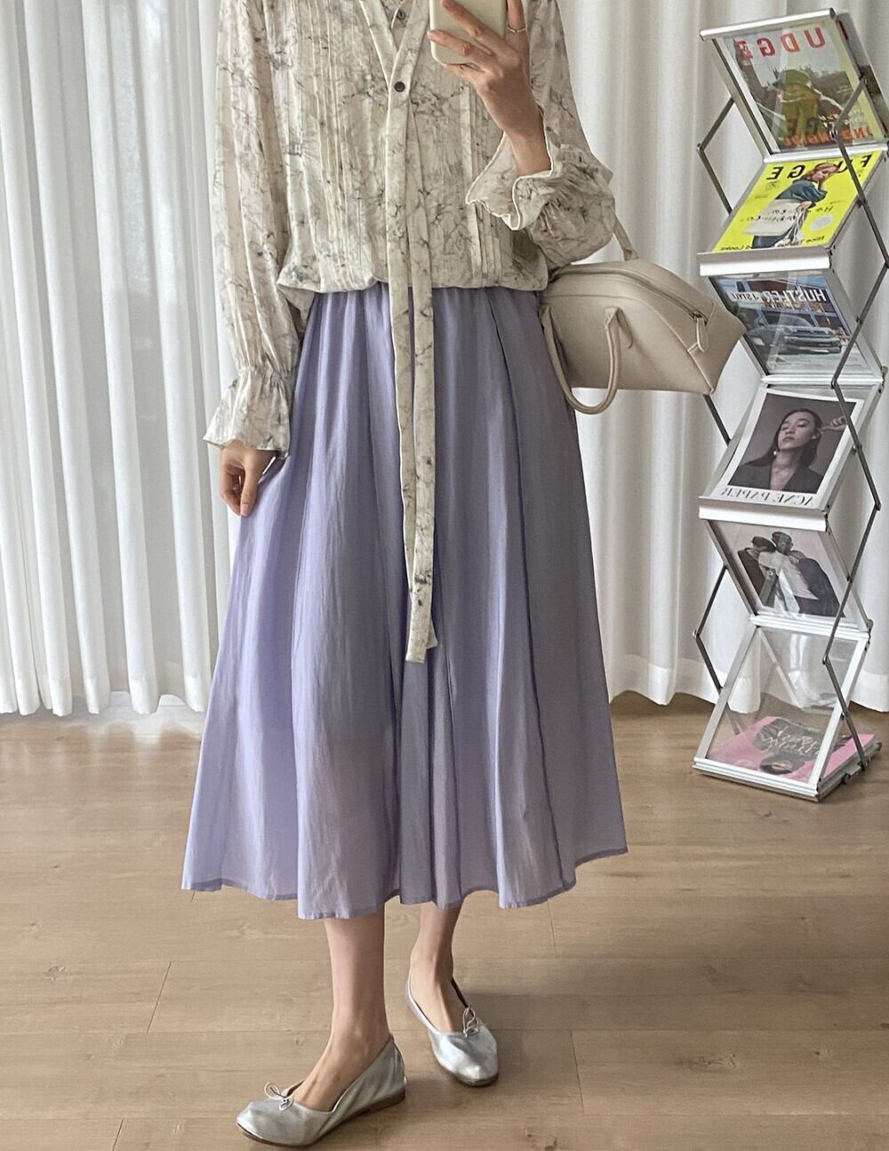 ウエストゴム仕様で楽にはけるギャザースカートです。裏地のない裾付近等はほのかな透け感がある軽やかな生地で、膝下のミモレ〜ロング丈ぐらいの丈感。こなれ感たっぷりのスタイルが楽しめます。合わせるトップスや靴、小物次第できれいめにもカジュアルにも着回せて大活躍間違いなし。