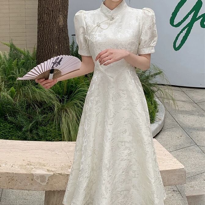 ホワイトカラーが品のある、Aラインセミフレアのチャイナドレス。