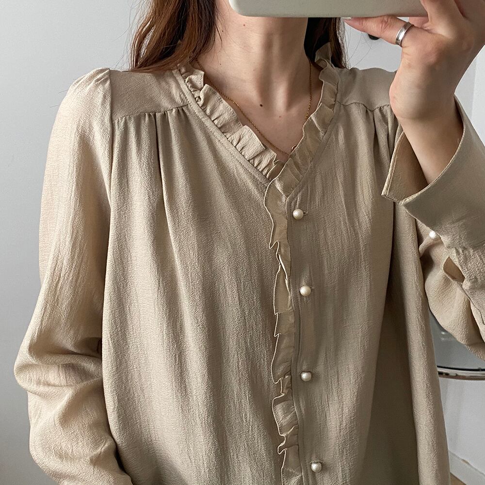 フリル使い コットンパール調ボタン レディース トップス ブラウス ミディアム丈 長袖 手元スリット Vネック 襟付き フリルカラー オーバーサイズ シワ加工 かわいい 大人可愛い きれいめ シンプル カジュアル 上品 おしゃれ こなれ感 フェミニン 無地 春 秋 ママ 女の子 オフィス OL 通勤 学生 学校 通学 デート お出かけ レストラン 女子会 休日 ホテル ショッピング カフェ 韓国 オルチャン コーデ 体型カバー 普段使い 着回し 清楚 M L ゆったり ホワイト イエロー カーキ ブルー