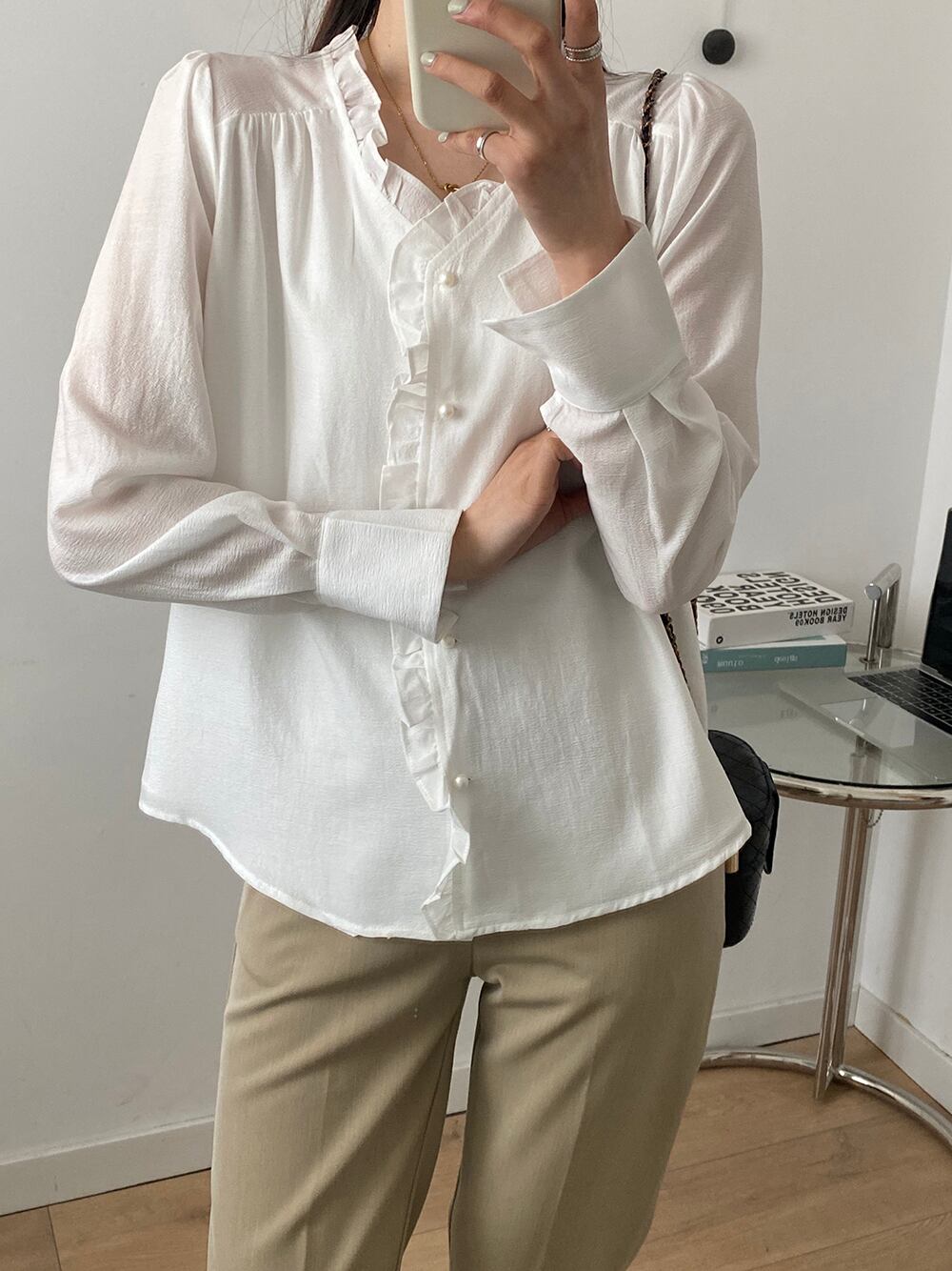 フリル使いやコットンパール調のボタンが可愛らしいVネックブラウスです。細かいシワが入った生地で、かっちりしすぎずこなれ感がある上品な着こなしに。ほどよくゆったりなシルエットですがボトムに裾インすればきちんと感が出せ、オフィスユース〜デートやお出かけまで色々なシーンで活躍します。