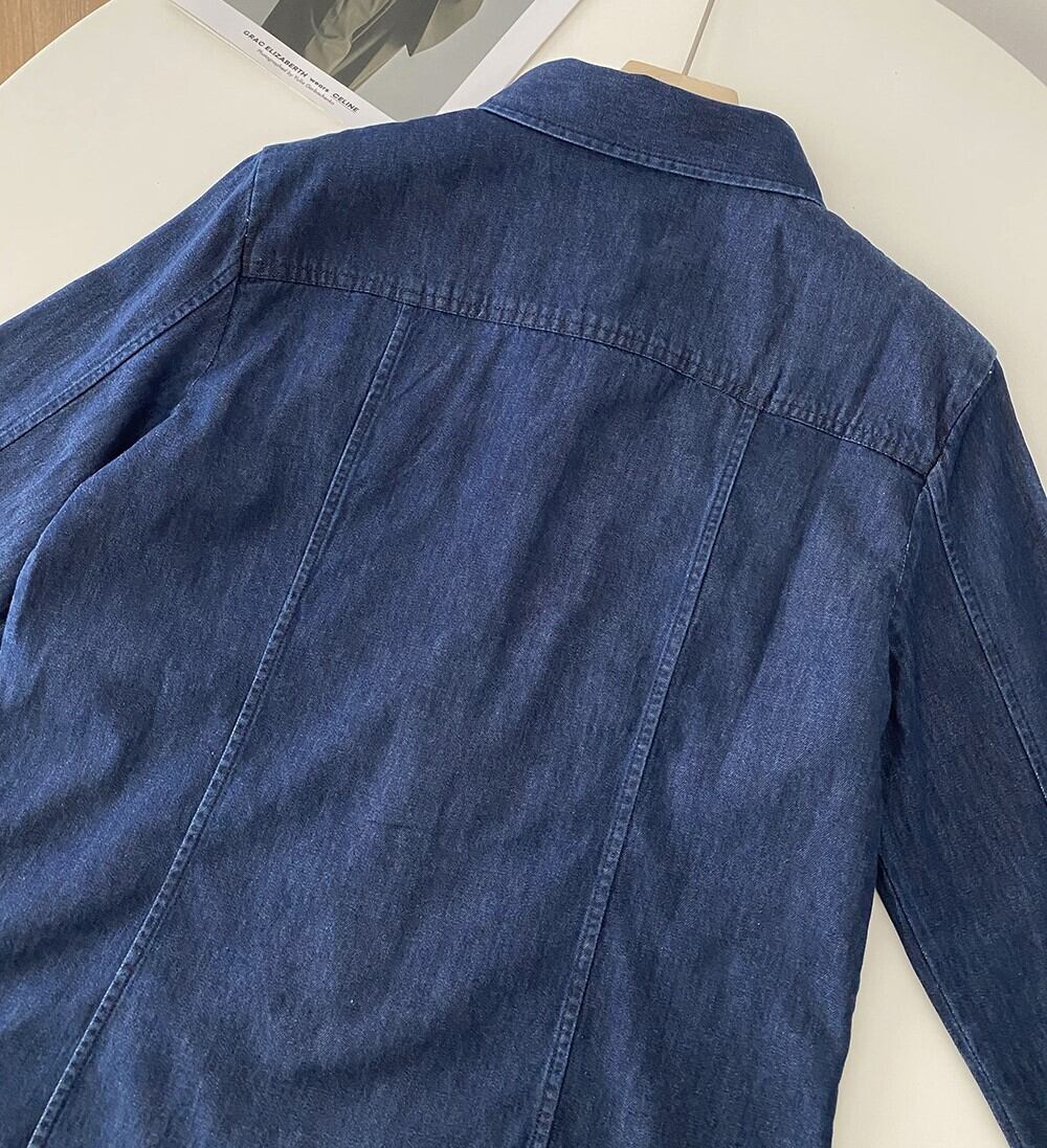 メタルボタンや胸ポケットのアクセントをきかせたデニムシャツです。やや濃いめのデニムブルーカラーが大人っぽく、きれいめスタイルにも合わせやすいゆるすぎないシルエットも魅力。1枚で着たり羽織りとして使ったりと色々な着こなしが可能です。