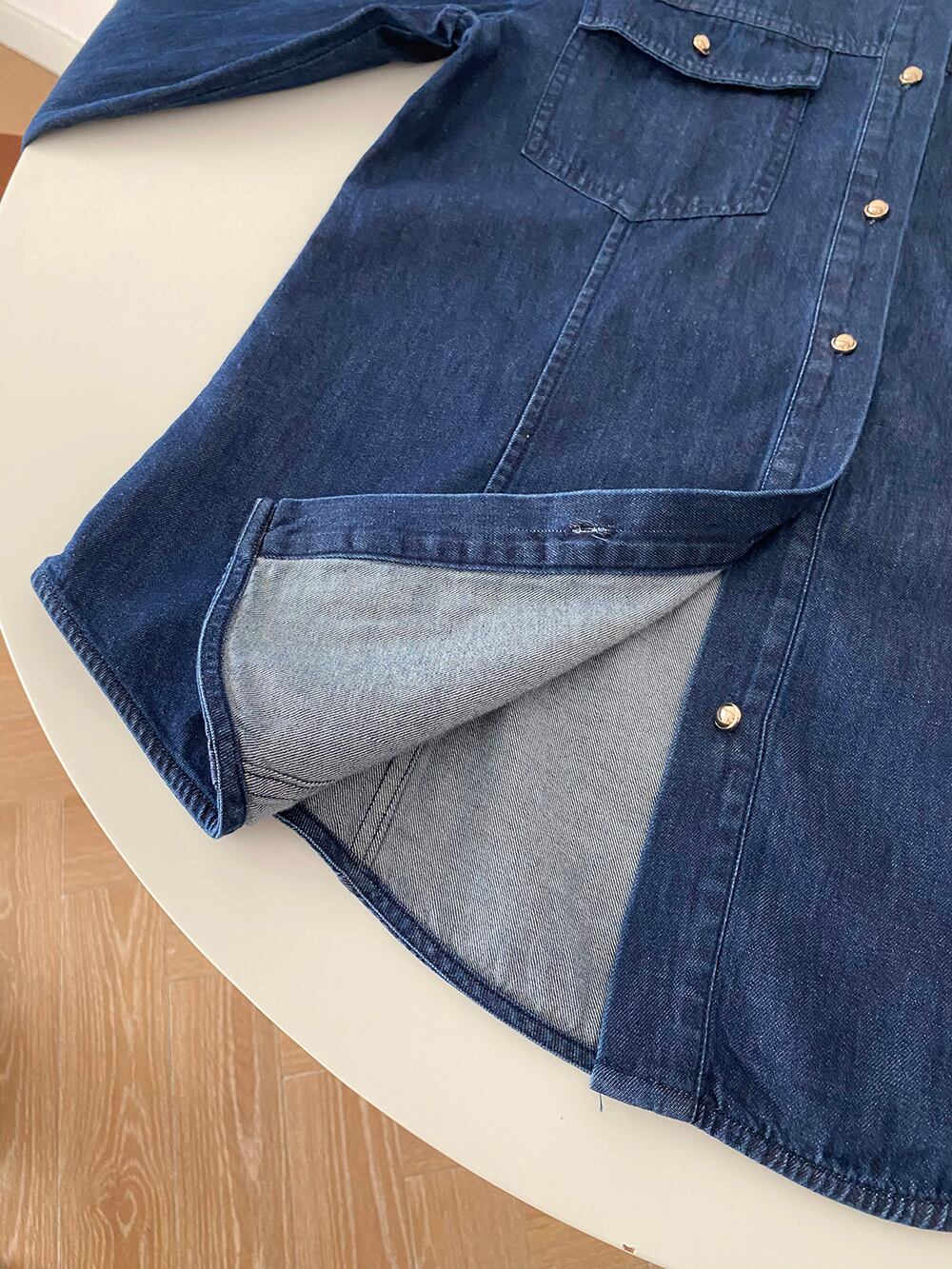 胸フラップポケット メタルボタン デニムシャツ レディース トップス シャツ ブラウス 羽織り ミディアム丈 長袖 ドロップショルダー 襟付き レギュラーカラー 前開き デニム かわいい 大人可愛い きれいめ シンプル カジュアル 上品 おしゃれ こなれ感 ボーイッシュ ベーシック アメリカン アクティブ 無地 春 秋 ママ 女の子 学生 学校 通学 デート お出かけ アウトドア キャンプ 旅行 公園 女子会 休日 高原 カフェ 重ね着 普段使い 着回し レイヤード 定番 M L ゆったり 青 ブルー