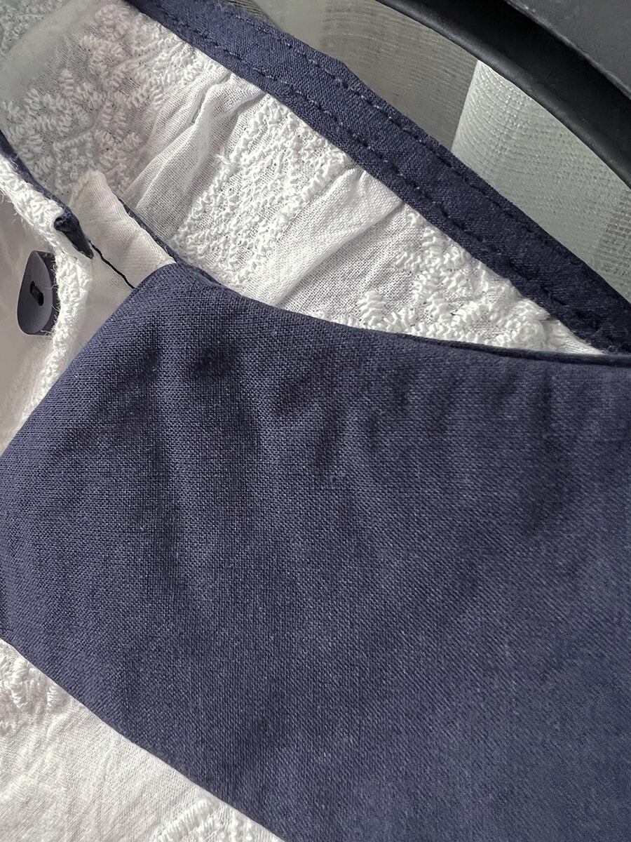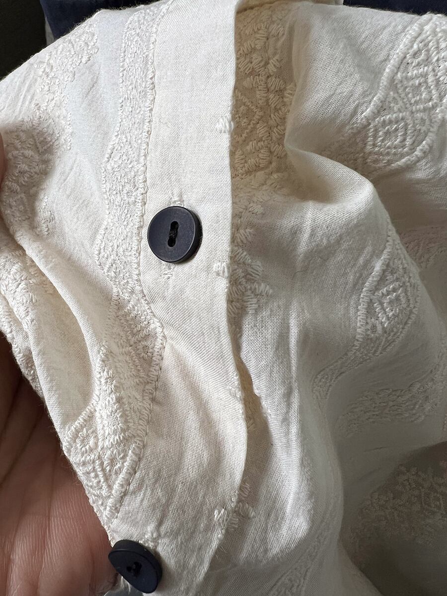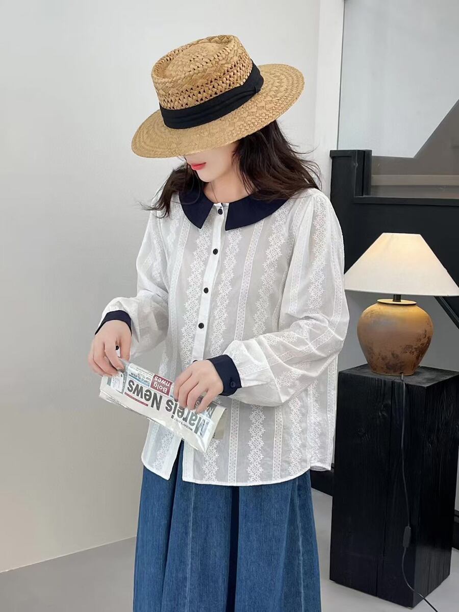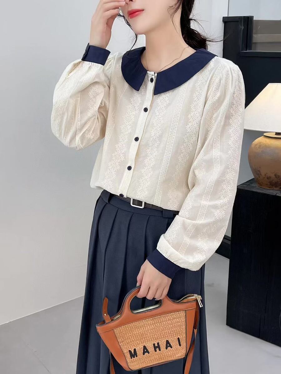 ライン状に配した花などのパターン刺繍が上品な長袖ブラウスです。襟とカフス・ボタンが配色デザインになっており、全体を引き締めてくれます。程よくゆったりなシルエットでリラックス感があり、どことなくレトロで清楚な着こなしに。