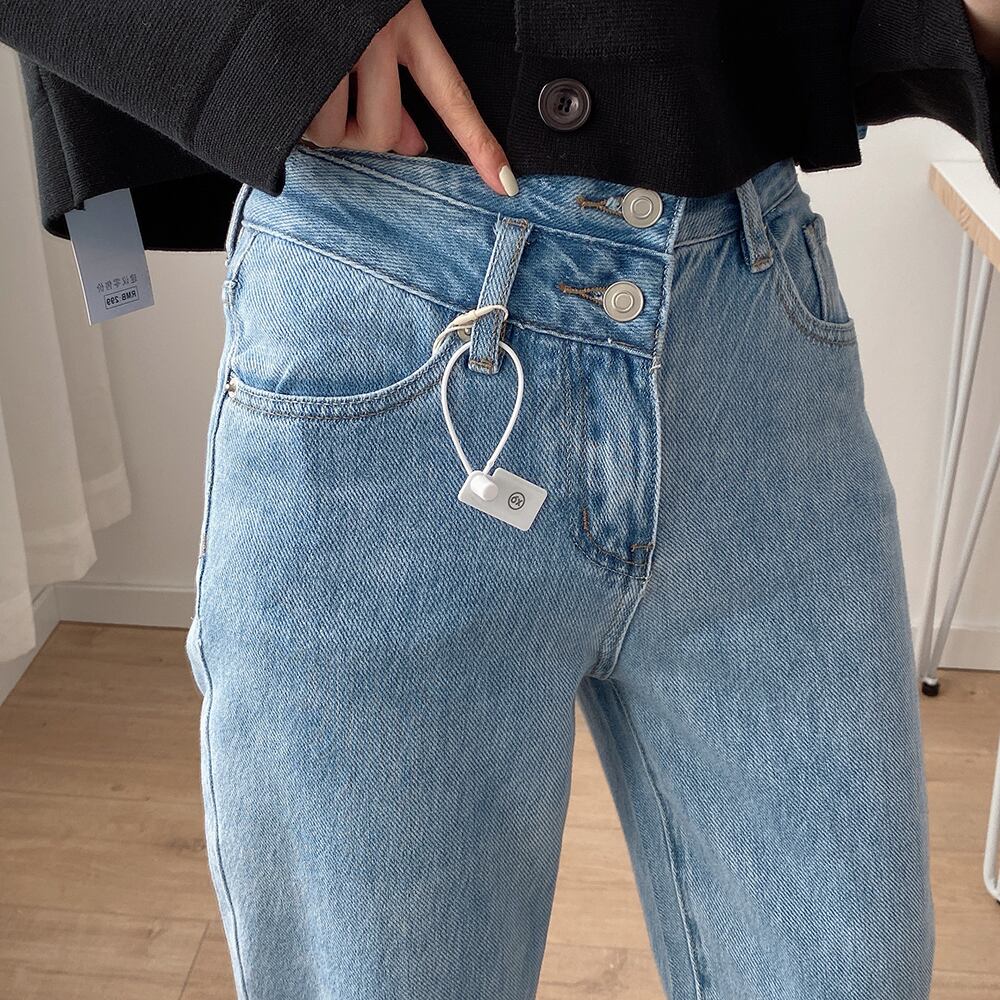 ウエストのボタン部分がダブるデザインになったちょっと個性的なストレートデニムパンツです。軽く洗いをかけたようなウォッシュデニムで、脚長に見せつつ足のお悩みをカバーできるハイウエストデザインのストレートシルエットです。