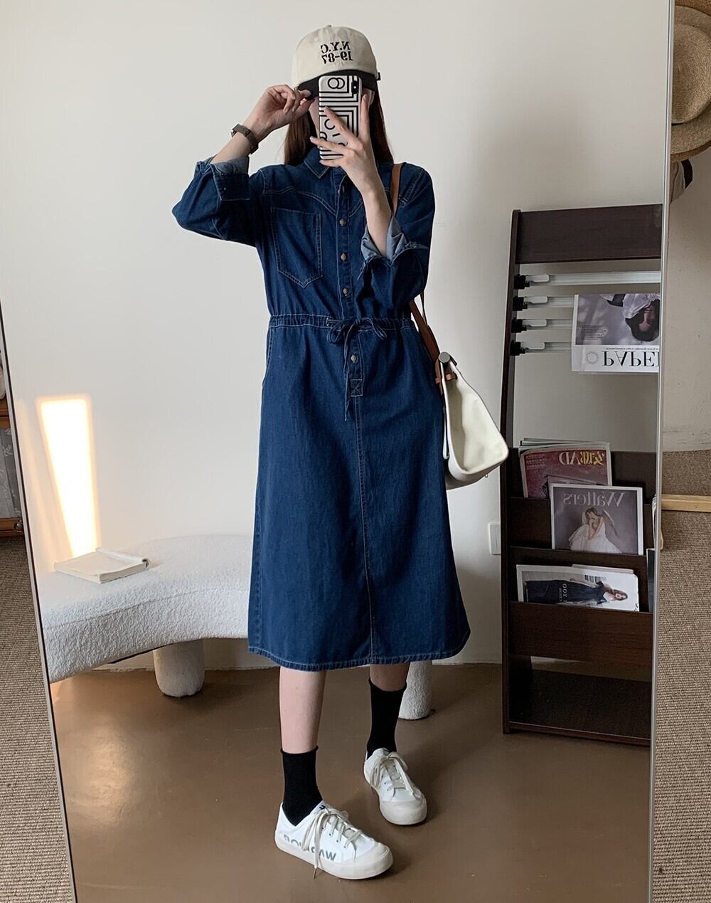 ウォッシュデニム ウエストドロスト レディース ワンピース シャツワンピ 膝丈 膝下 ミモレ ミディアム丈 長袖 襟付き 角襟 レギュラーカラー Iライン ウエストマーク バックスリット ポケット フロントボタン 配色ステッチ ブルーデニム かわいい 大人可愛い シンプル カジュアル 上品 おしゃれ レトロ アメカジ リラクシー 無地 春 秋 冬 ロングシーズン ママ 女の子 学生 学校 通学 デート お出かけ 女子会 休日 重ね着 楽ちん 体型カバー 普段使い 定番 M L XL ゆったり 青 ブルー