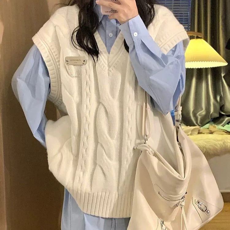 カレッジ風スタイルにぴったりな、ゆったりとしたニットベスト。