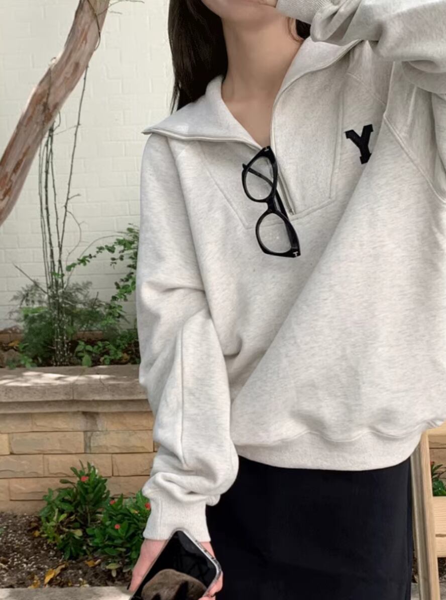 襟付き ハーフジップ トレーナー レディース トップス プルオーバー 丈長 長袖 ハイネック スタンドカラー 刺繍 ファスナー 薄手 厚手 かわいい 大人可愛い シンプル カジュアル おしゃれ こなれ感 ルーズ ロゴ 英字 春 秋 冬 ママ 通勤 学生 学校 通学 デート お出かけ 旅行 公園 女子会 休日 ショッピング カフェ 重ね着 暖かい 体型カバー 普段使い 着回し レイヤード S M L ゆったり ゆる グレー ネイビー グレーホワイト