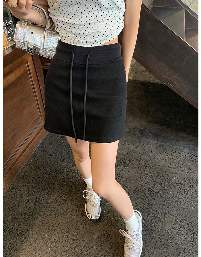 ハイウエストのミニ丈デザインで脚長効果抜群の台形スカートです。ウエストドロストが付いたAラインシルエットでパンツ型の裏地がドッキングしたデザインなので風の強い日や階段を上る時なども安心。