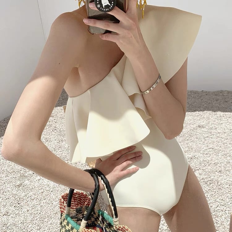 レディース 水着 スイムウェア ワンピース 体型カバー ワンショル パッド付き フリルショルダー フリルカラー フリル 伸縮性 かわいい 大人可愛い きれいめ シンプル カジュアル 大人っぽい おしゃれ お洒落 ラブリー キュート ガーリー スタイリッシュ かっこいい ベーシック フェミニン 無地 リゾート 旅行 温泉 プール 夏 海 ビーチ 海外 美脚 脚長 スタイルアップ 韓国 高見え モテ インスタ映え こなれ感 SNS映え スタイル コーディネート サイズ展開 M L XL スリム ホワイト 白