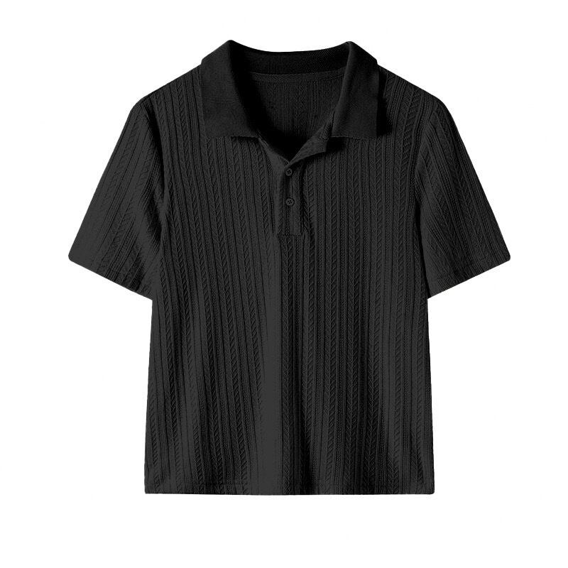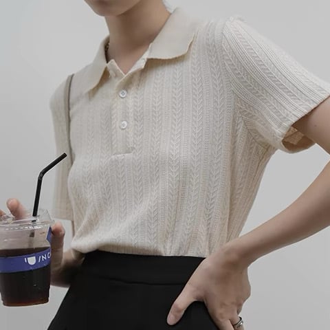 リブニットの半袖ポロシャツ。