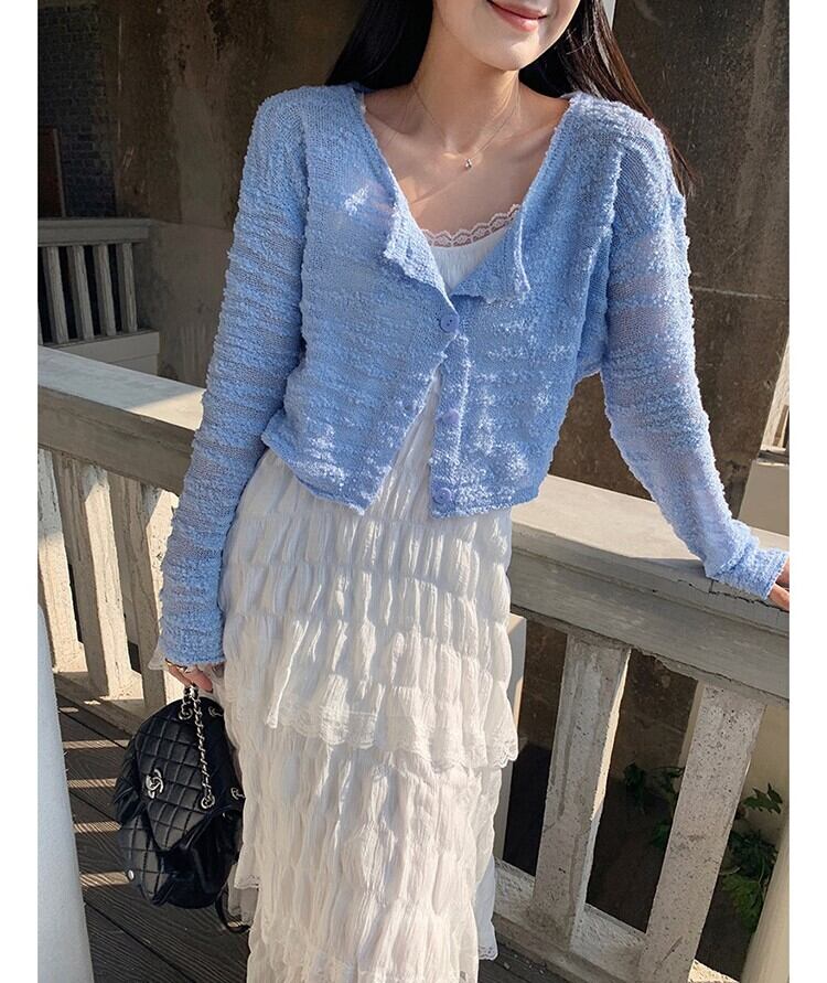 ボーダー柄調編地 ややシアー クロップド レディース トップス カーディガン 羽織り ショート 長袖 ドロップショルダー 萌袖 Uネック 襟なし 前開き 透け感 ニット ウール混 かわいい 大人可愛い シンプル カジュアル 上品 おしゃれ レトロ こなれ感 キュート ナチュラル フェミニン 横縞 シマ模様 春 秋 女の子 学生 学校 通学 デート お出かけ 女子会 休日 合コン カフェ 重ね着 韓国 オルチャン コーデ 脚長 普段使い 着回し レイヤード M L ゆったり ブルー グリーン オフベージュ