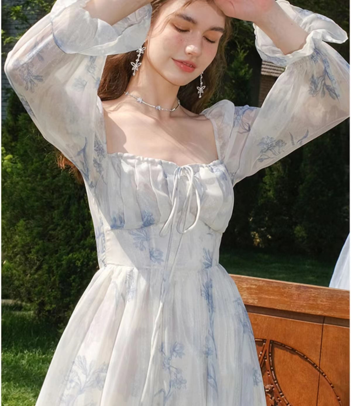 レディース ワンピース ロングスカート ロング 長袖 ベルスリーブ 袖透け感 スクエアネック Aライン ハイウエスト かわいい 大人可愛い きれいめ シンプル カジュアル 上品 おしゃれ ガーリー ふんわり ゆるふわ フェアリー 花柄 フラワー 春 夏 デート お出かけ パーティー イベント バカンス コーデ 楽ちん 清楚 定番 S M L XL ライトブルー