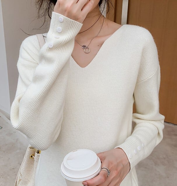 袖口に縦に並んだ4つボタンがアクセントになり、鎖骨をちょっと見せるセクシーさも漂うセーターです。ラウンドネックとVネックを組み合わせたようなネックラインが女性らしく、ネックレスなど首元のおしゃれが映えるデザイン。ほどよくゆったりなシルエットでこなれ感が出せ、通勤や通学・デートやお出掛けなど色々なシーンで活躍してくれること間違いなし!シンプルなデザインなので、合わせるアイテムを選ばず着回し力も抜群です。