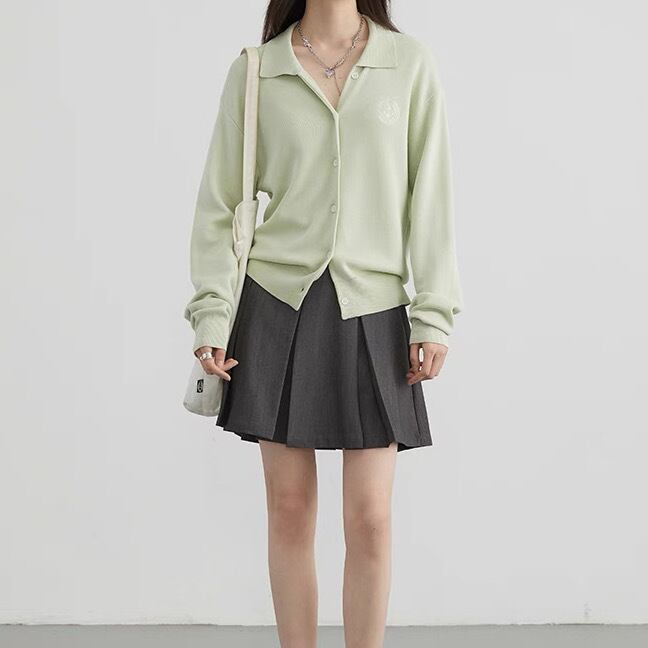 レディース トップス ニット カーディガン 羽織 前開き 長袖 ドロップショルダー Vネック 襟付き ポロカラー ストレート 刺繍 ボタン 大人可愛い シンプル カジュアル 上品 おしゃれ レトロ こなれ感 ルーズ 抜け感 キュート クラシカル カレッジ風 学生風 ベーシック 無地 ロゴ 春 秋 母の日 授業参観 ママ 学生 学校 通学 デート お出かけ 公園 女子会 休日 ショッピング 韓国 コーデ 普段使い 着回し 清楚 サイズ展開 S M L グレー ダークグレー 緑 グリーン 大人カラー 春カラー