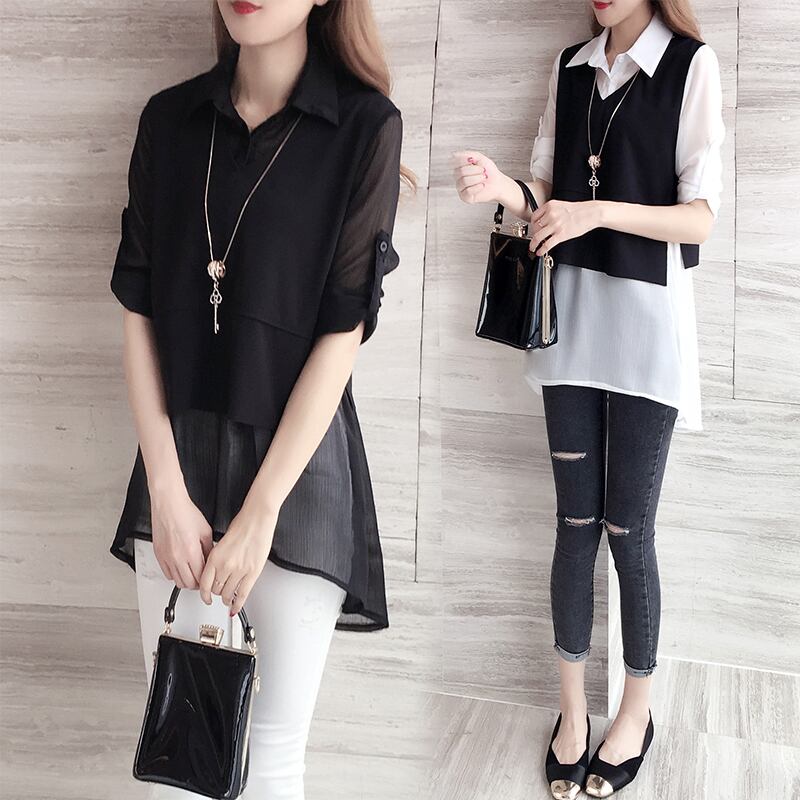 レディース トップス シャツ ベスト フェイクツーピース レイヤード ロング 5分袖 Vネック 襟付き ストレート かわいい 大人可愛い きれいめ シンプル カジュアル 上品 おしゃれ かっこいい クール 大人っぽ 無地 ストライプ 春 夏 秋 オフィス ビジネス OL 通勤 デート お出かけ コーデ 楽ちん レイヤード ロールアップ S M L XL 2XL 3XL 4XL 白 ホワイト 黒 ブラック 水色 ブルー