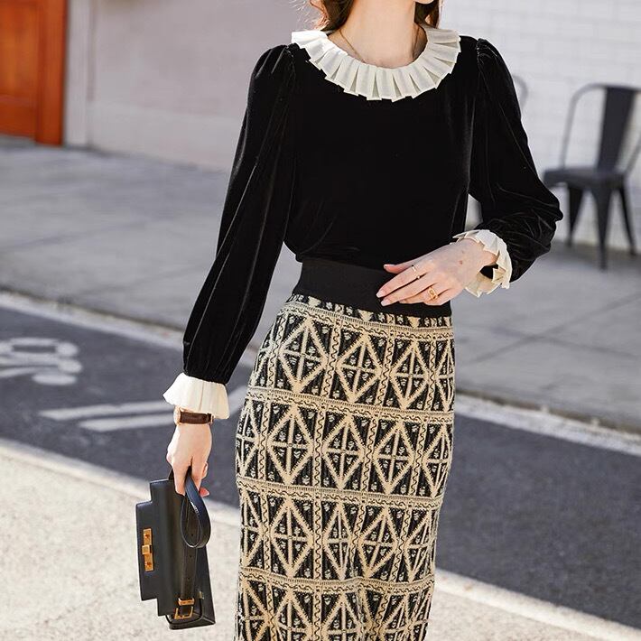 レディース トップス プルオーバー 長袖 フリル袖 ラウンドネック 襟付き フリルカラー スリム 細身 フォーマル フェミニン フリル 配色 ベロア かわいい 大人可愛い きれいめ シンプル 上品 おしゃれ レトロ ガーリー エレガント ヴィンテージ プリンセス クラシカル ロマンティック 無地 秋 冬 卒業式 卒園式 謝恩会 授業参観 ママ デート お出かけ レストラン 女子会 休日 ショッピング カフェ 韓国 コーデ 普段使い 着回し モテ 清楚 S M L XL 2XL 大きいサイズ 黒 ブラック