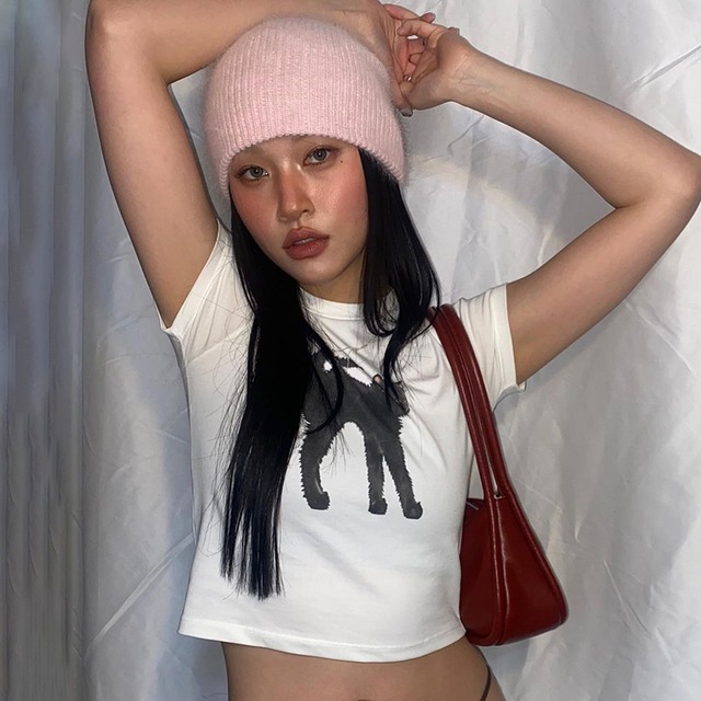 猫好き必見!可愛い猫プリントがポイントのTシャツが登場しました。シンプルながらも存在感のあるデザインで、おしゃれなコーディネートにぴったりです。ミニ丈なので、スリムなシルエットを演出し、女性らしい着こなしに仕上げます。