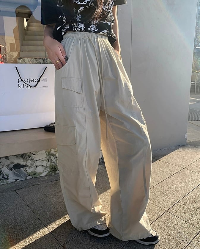 レディース カジュアルパンツ パンツ ストレートパンツ ワイドレッグパンツ ウエストゴム ポケット ハイウエスト ルーズ きれいめ 上品 おしゃれ お洒落 大人可愛い 大人女子 かっこいい シンプル クール モダン シック レトロ 主役級 存在感 こなれ感 抜け感 春 夏 20代 30代 40代 OL 通勤 お出かけ デート 女子会 お泊まり 旅行 休日 ショッピング 普段使い 韓国 オルチャン 美脚 脚長 ファッション コーデ トレンド 流行 スタイル 楽チン ワンサイズ オフホワイト カーキ ブラック
